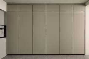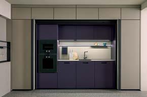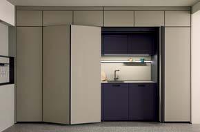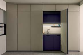 Ein Schrank, der das Versteckspiel beherrscht: Das Pocketsystem macht aus dem Möbel einen Verwandlungskünstler, der mal als Homeoffice-Lösung mal als Barschrank fungiert oder beliebig viele Funktionen der Küche aufnehmen kann, bis hin zur voll funktionsfähigen Pantry-Küche.