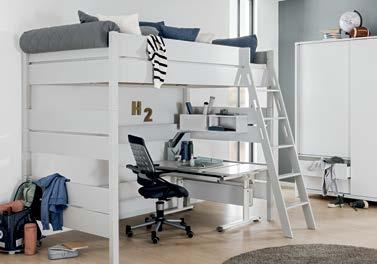In einem kleinen Zimmer sorgt das Hochbett für zusätzlichen Platz, um darunter einen Schreibtisch unterzubringen oder eine Sitzecke einzurichten. Das vorhandene Bett kann flexibel umgebaut werden, beispielsweise vom abenteuerlichen Spielbett zum gemütlichen Jugendbett.