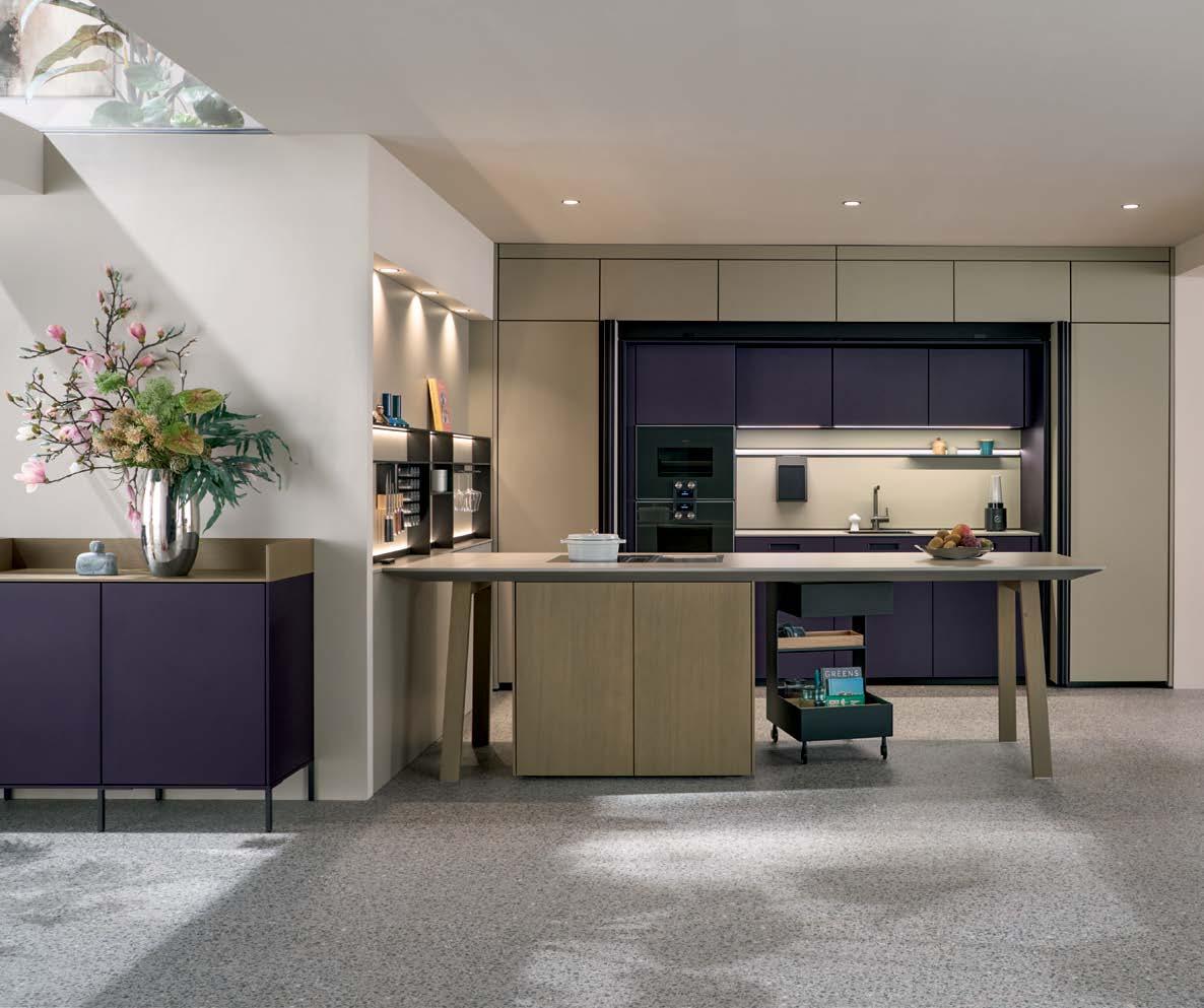 Das Leben ist bunt: Design-Neuheit Front in Aubergine samtmatt, Ceramic Struktur sand in Kombination mit Eiche elegant perlgrau.