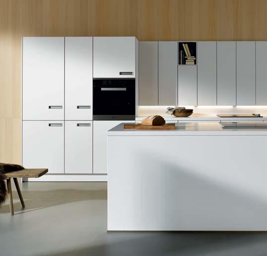Ein liebevolles Detail: die in die Front integrierten Muschelgriffe, die den funktionalen Touch der Küche unterstreichen. Durchgängig: die vertikalen Linien der 30 cm schmalen Schränke und der Hochschränke. Diese Küche bietet viel Platz für das Wesentliche.