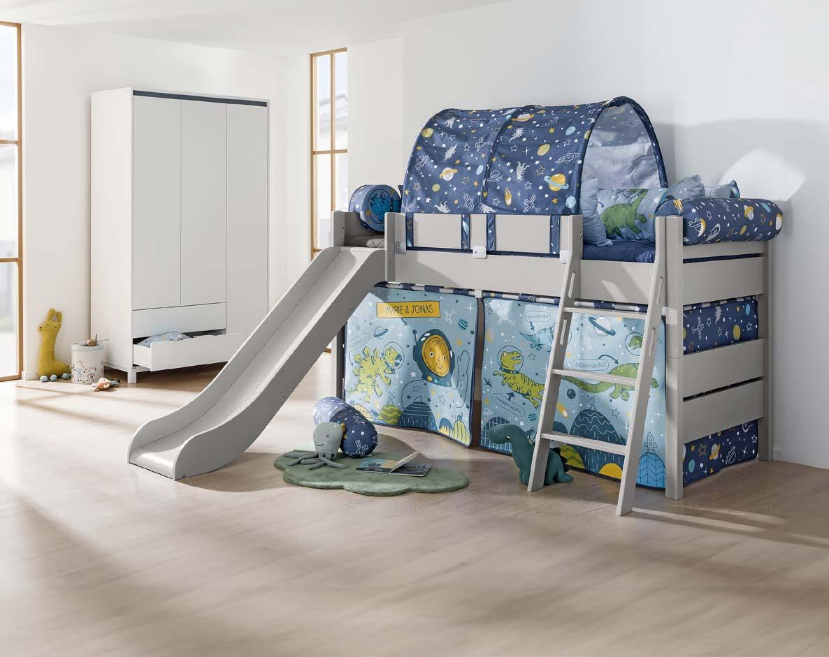 Spielbett, Höhe 120 cm, Breite 90 cm in Kieselgrau, mit schräger Griffleiter und Rutsche. Motiv-Textilien, Lattenrost und Matratze gegen Mehrpreis.