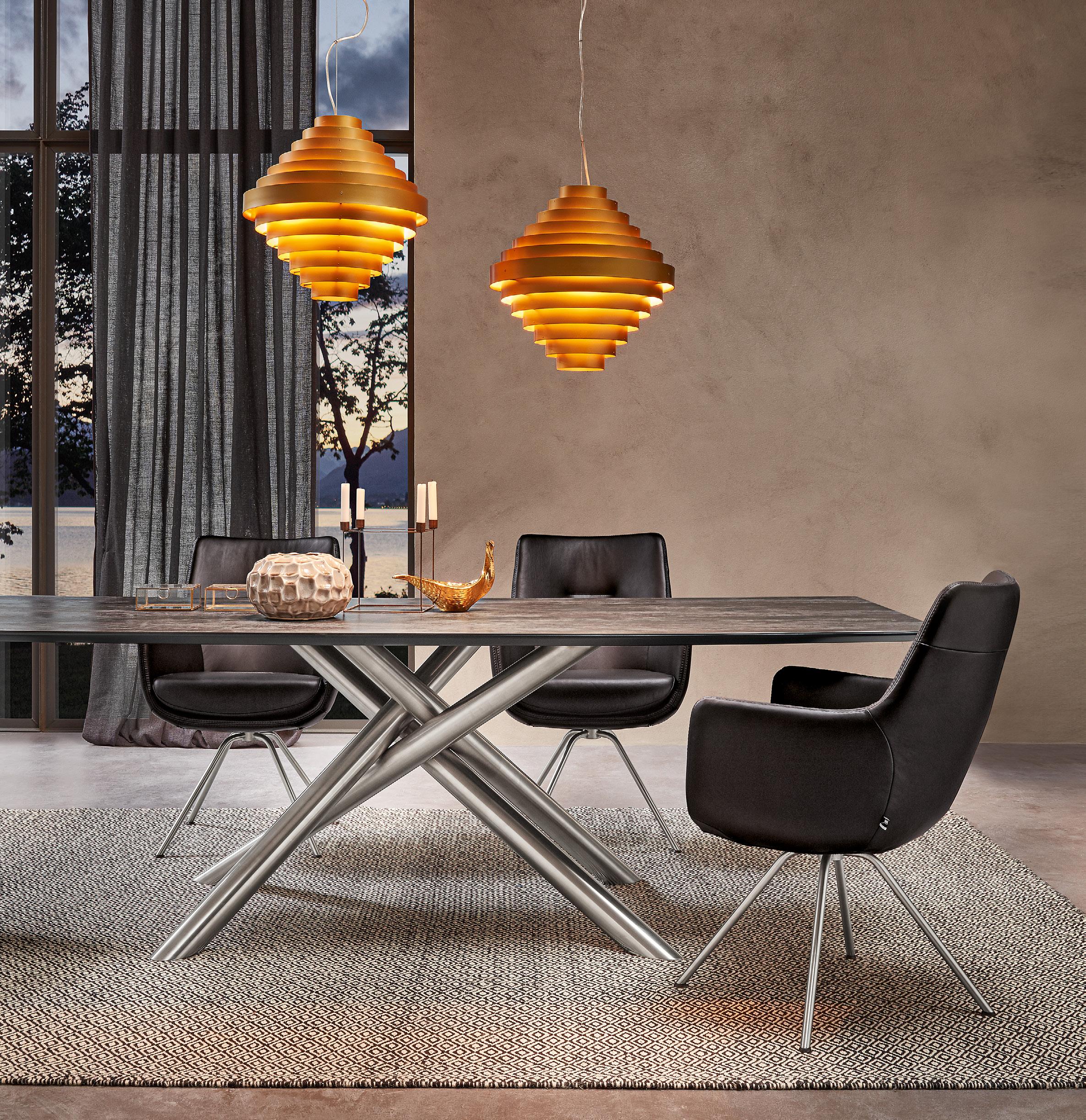 WK 852 Esstisch (WK852-3), Platte: Keramik Oxido Darknight, Gestell: Kreuzfuß gedreht, ca. B 240 x 100, H 76 cm: 3883,-, Gegen Aufpreis: Gestell in Edelstahl: 879,-, Gesamtpreis (wie abgebildet): 4762,- (Ohne Dekoration.)