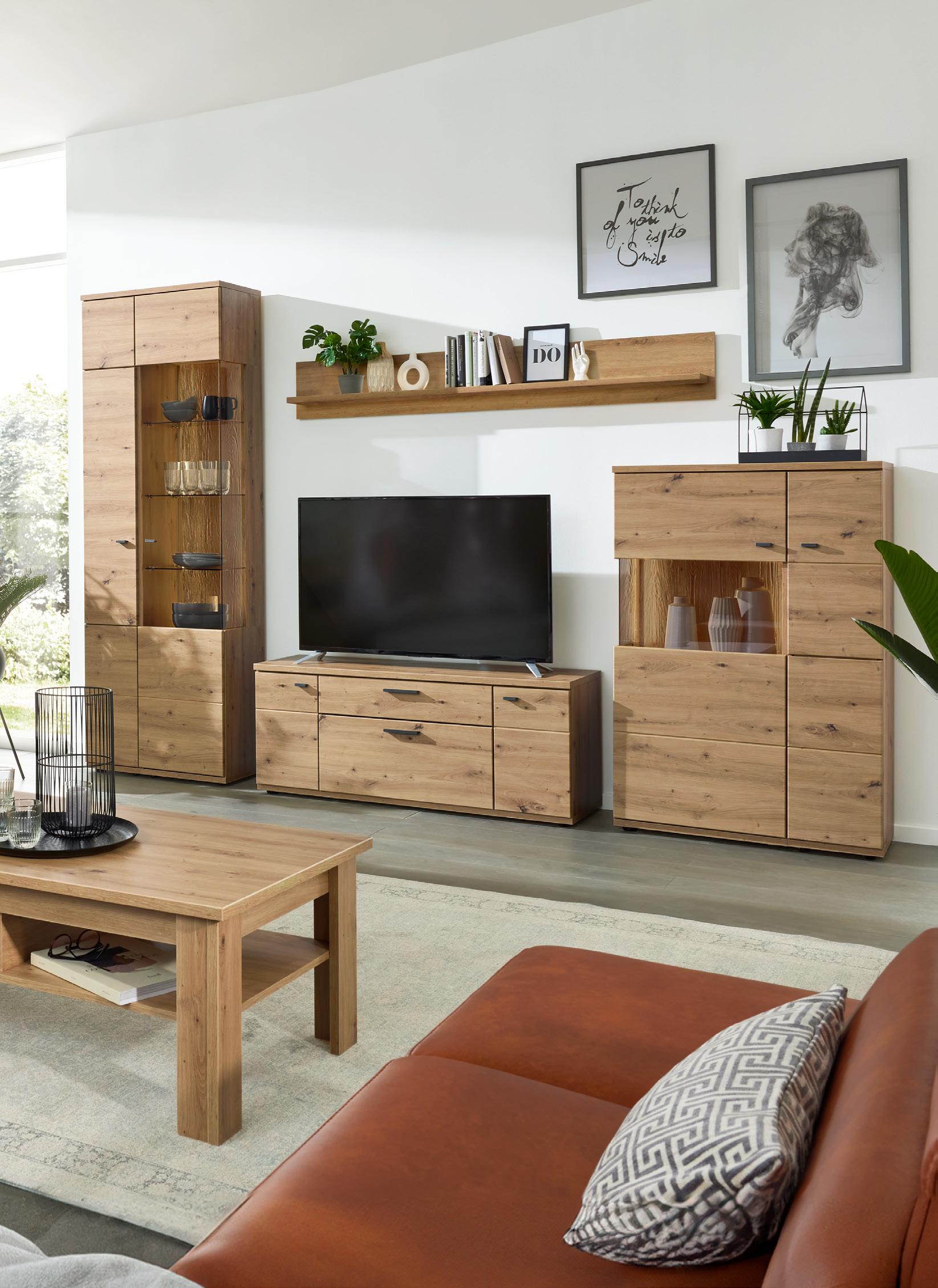 Interliving Wohnzimmer Serie 2110 - Front und Korpus Alteiche Nachbildung, sichtbare Rückwände geschroppt. 1I Wohnkombination, best. aus Vitrine, Lowboard, Wandboard und Highboard, ca. B330/H216/T45 cm. 2I Sideboard, ca. B180/H86/T40 cm. 3I Couchtisch, geteilte Ablagefläche, ca. B120/H45/T70 cm. Interliving Wohnzimmer Serie 2110 - Front und Korpus Naturbuche Nachbildung, sichtbare Rückwände geschroppt. 4I Wohnkombination, best. aus Vitrine, Lowboard, Wandboard und 2 Hängeelementen, ca. B315/H216/T45 cm.