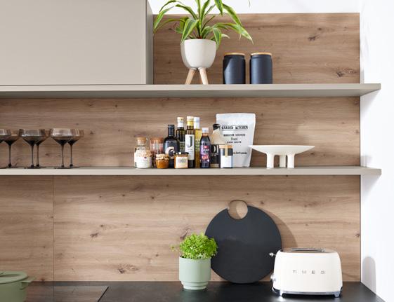 Die Nischenrückwand mit Regalboards bietet praktischen Stauraum und Platz für Dekoration.