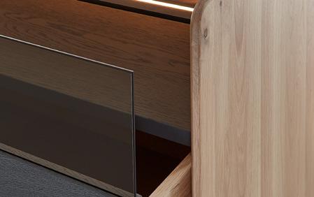 Lamellen-Akzent an den Fronten und optional für die Vitrinen-Rückwände. Optional können Sie Ihr Möbelstück mit den carbonfarbigen Mattglas-Applikationen verfeinern, um einen Hauch von Luxus in Ihr Wohnzimmer zu bringen. Diese Kombination unterstreicht auch die Exklusivität dieses einzigartigen Massivholzmöbels.