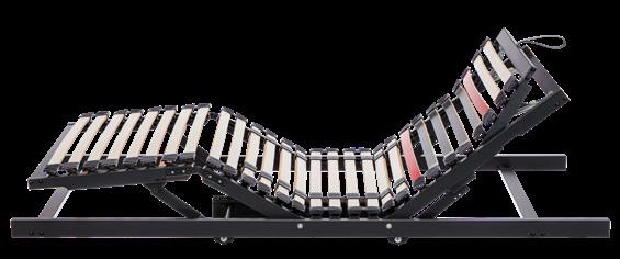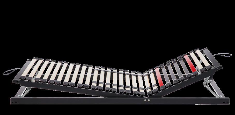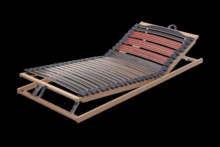 28 Federschichtholzleisten aus Buchenholz, 5 Doppelleistenpaare mit 20 arretierbaren TWIN-Schiebern und 20 herausnehmbaren Federwegsbegrenzern zur individuellen Härteregulierung, Rahmenhöhe ca. 85 mm.