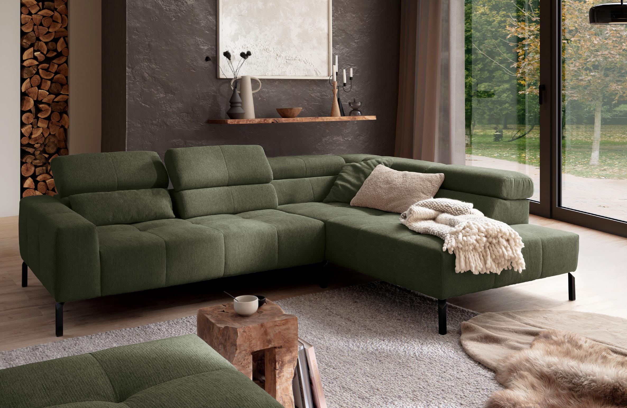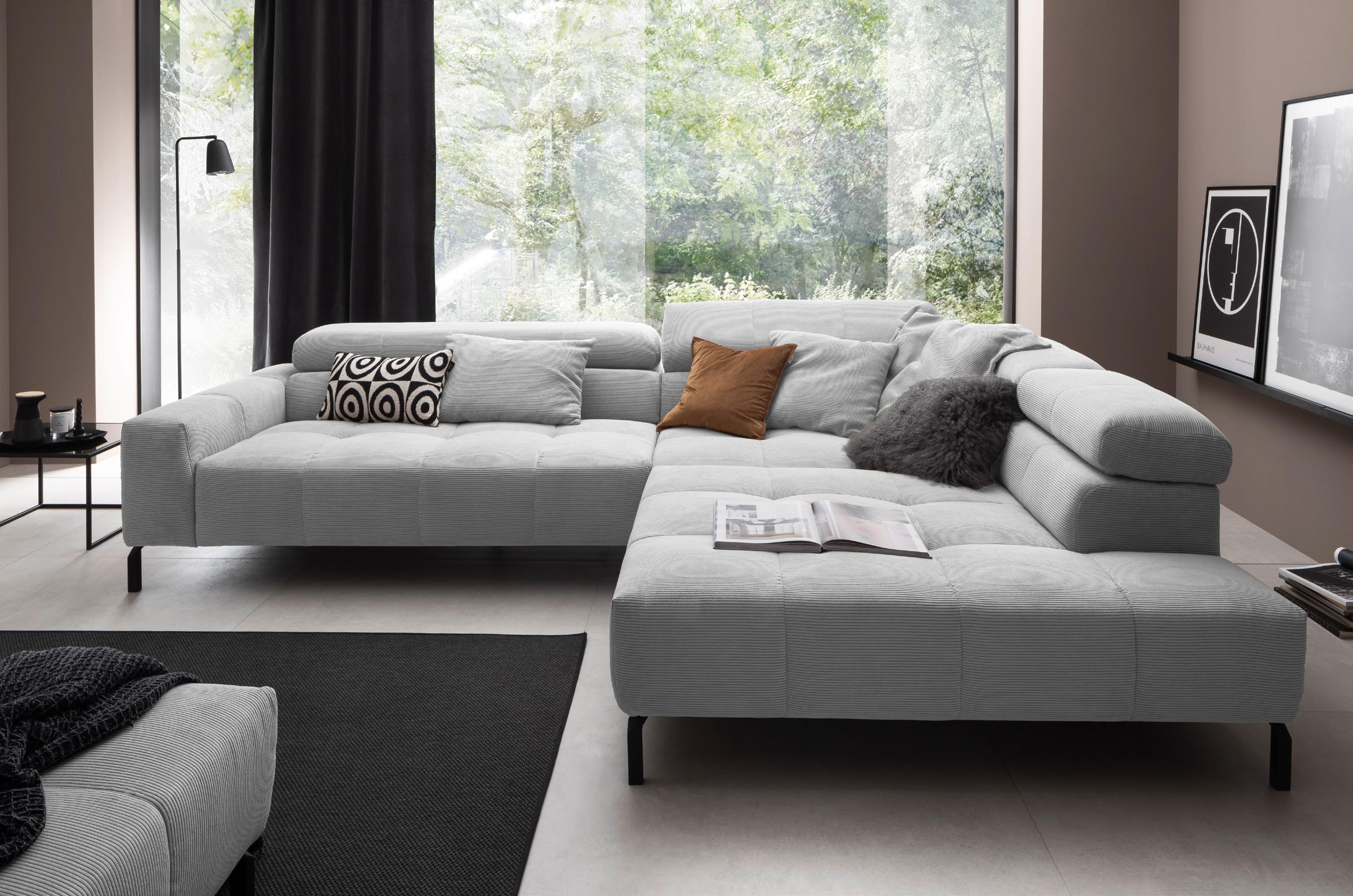 Eckkombination, Bezug Stoff, Metallfuß schwarz, best. aus: 2,5-Sitzer mit Armteil links inklusive 2x Kopfteilverstellung und Canapé mit Armteil rechts inklusive 1x Kopfteilverstellung Stellmaß ca. 244x194 cm. Bezug: 100% Polyester. Ohne Zierkissen.