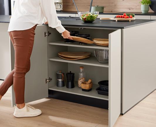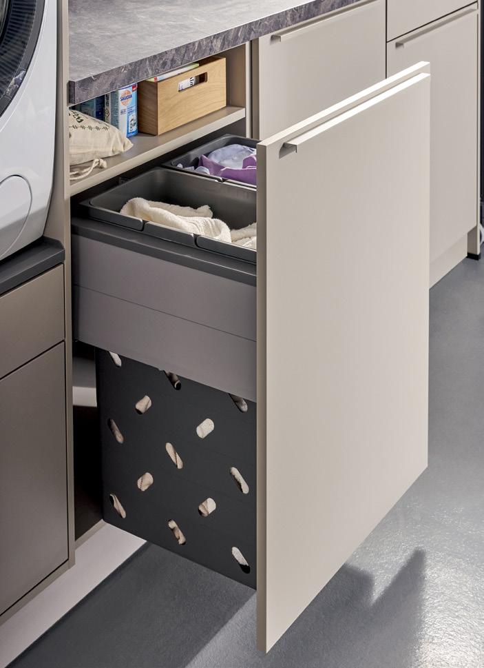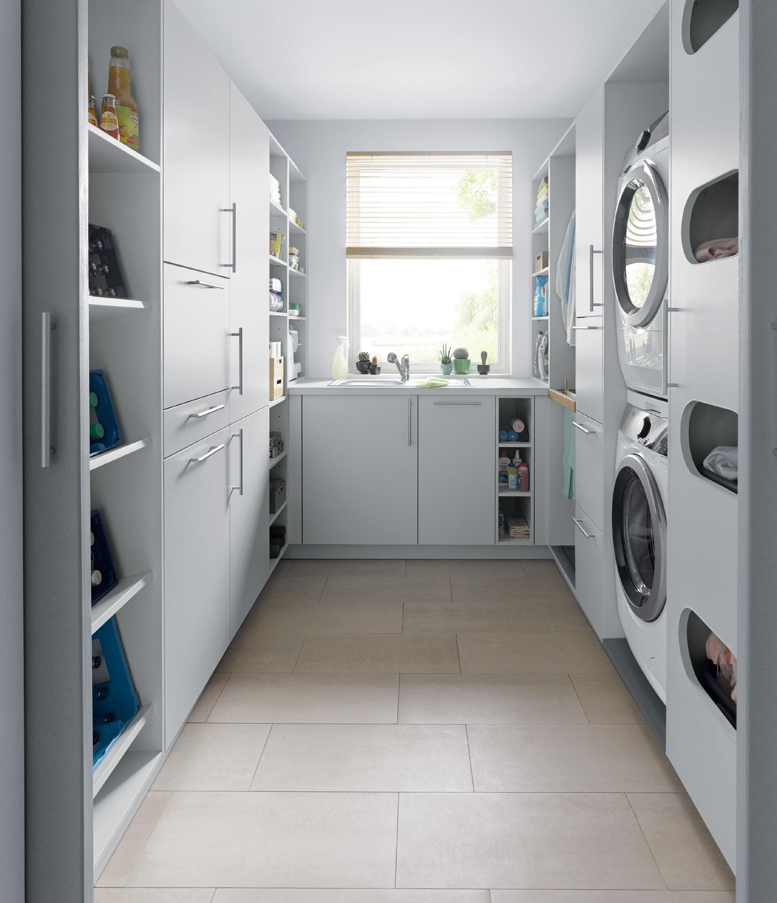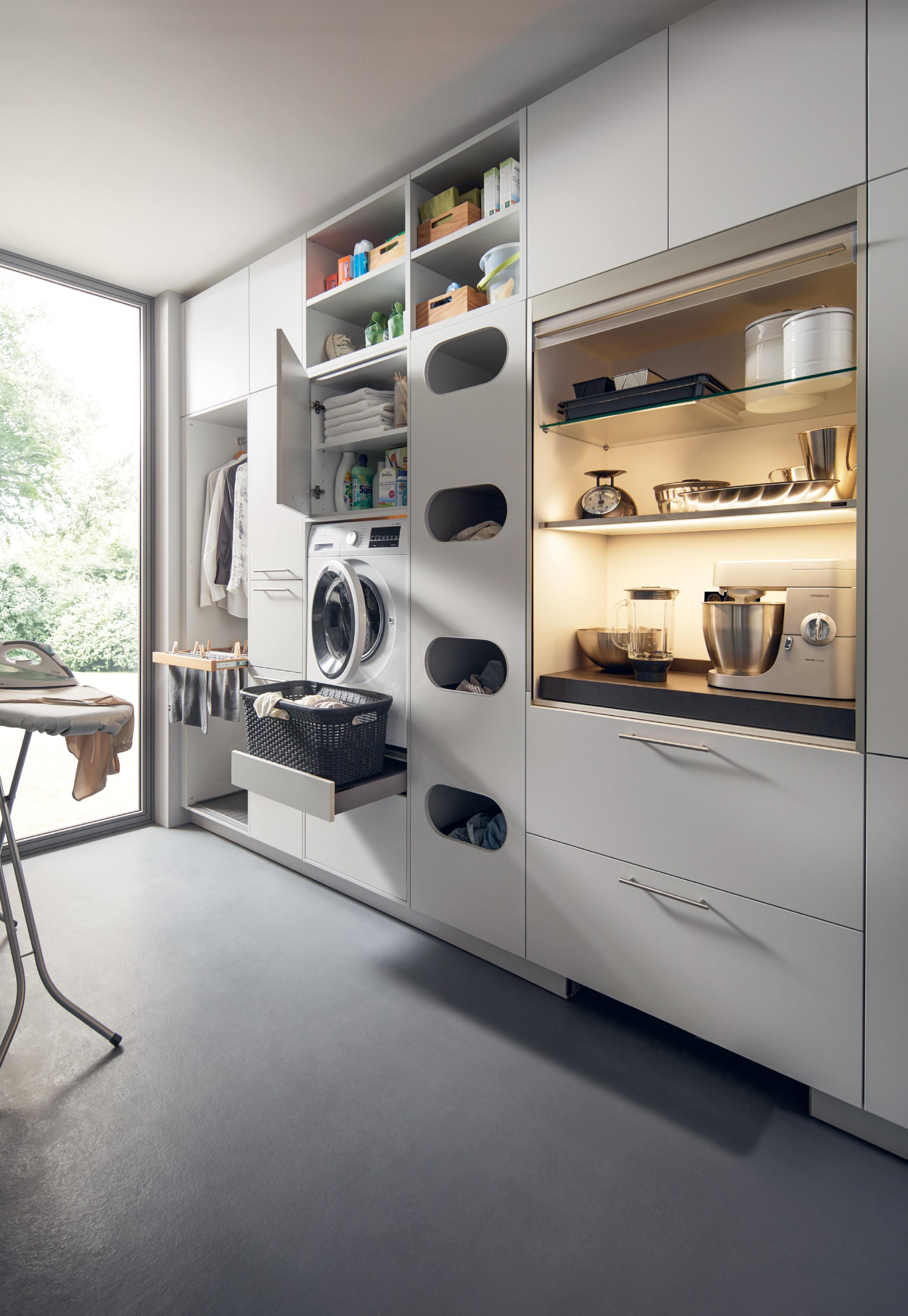 haben oder eine Zeilenlösung bevorzugen: Dieses modulare Konzept bietet passgenaue Lösungen zur Organisation des Haushalts. So sind Waschmaschine und Trockner, Besen und Bügelbrett, Schuhe und Wertstoffsäcke sowie Saugroboter genauso unsichtbar wie ergonomisch untergebracht.