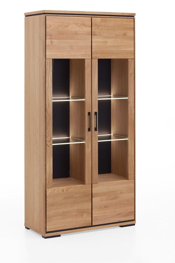 Vitrine, Wildeiche teilmassiv geölt, Rückwände hinter Glas schwarz, 2 Holztüren mit Glaseinsatz, 4 Glaseinlegeböden, B/H/T ca. 94x203x43 cm.