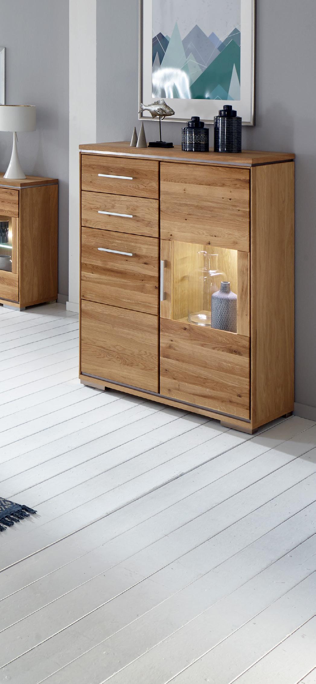 In diesem Massivholzmöbel finden Sie einen exklusiven Begleiter für ein gemütliches und zeitloses Wohnambiente. Die edle Wildeiche verleiht Ihrem Wohnzimmer einen gemütlichen Charakter und schafft eine zeitlose Atmosphäre. Auf Wunsch auch in Erle erhältlich. Ein besonderes Highlight dieses Modells ist der elegante