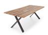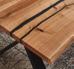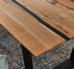 Tafeltisch, Charakter-Eiche massiv, mit Epoxidharz-Füllungen schwarz, individueller, meist doppelter Aderverlauf, Risse, Äste und Bruchstellen aufgefüllt, Oberfläche geölt, rechteckig mit Baumkante, Stirnseite gerade, X-Gestell Metall schwarz, ca. 220x100 cm
