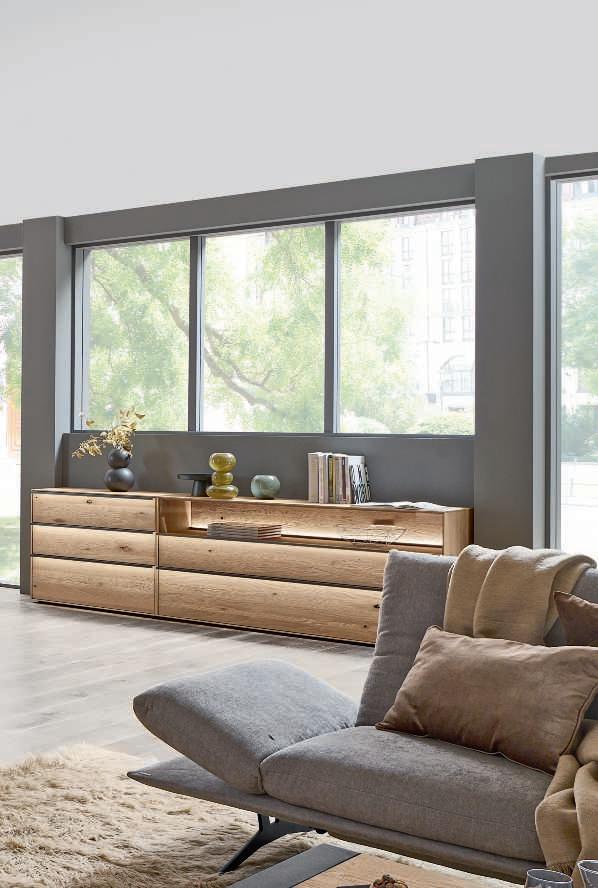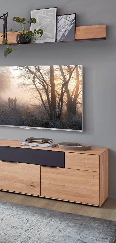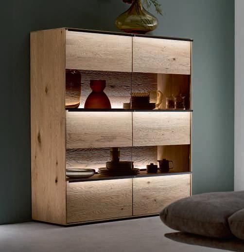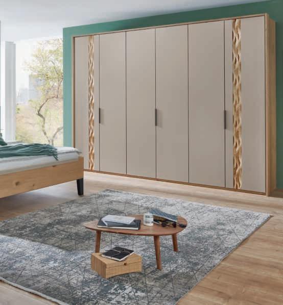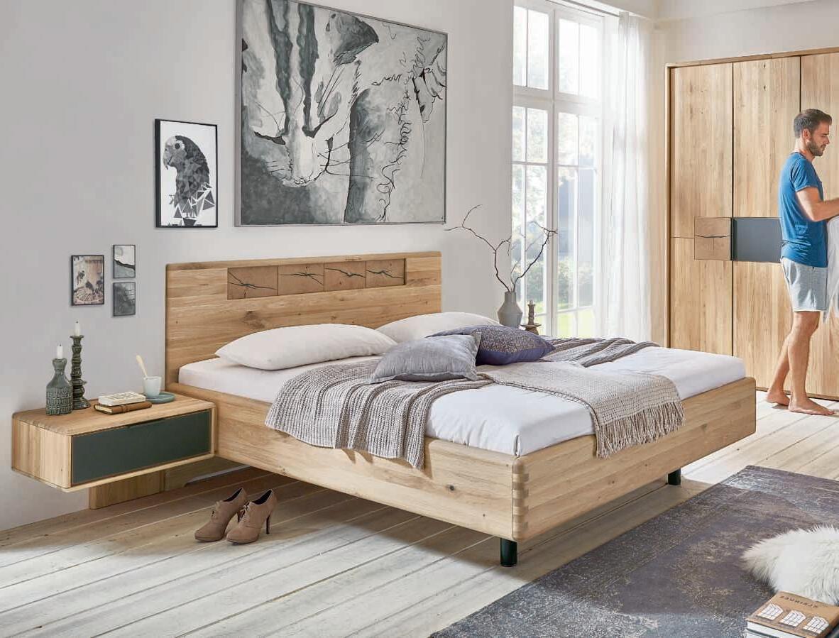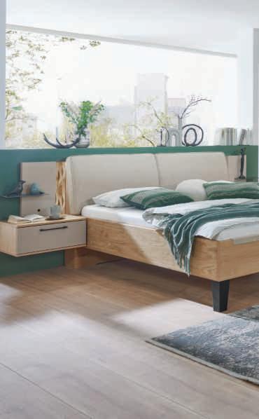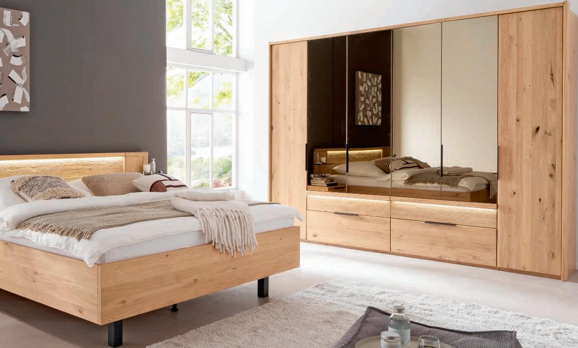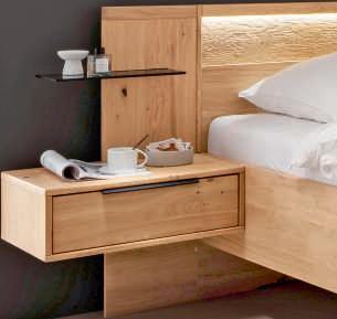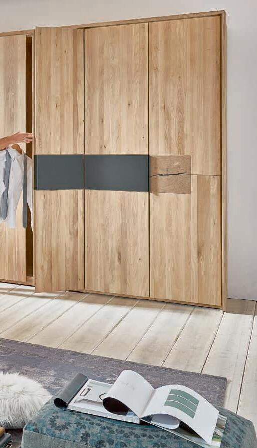 SCHLAFZIMMER-KOMBINATION, dieses Modell transportiert den Charme der Berge direkt in Ihr Schlafzimmer. Schwebend und erhabend verbinden sich hier Tradition und Moderne zu einer harmonischen Schönheit. Hier in Wildeiche massiv, Absetzungen in Hirnholz und Mattglas Kubanit. H70002