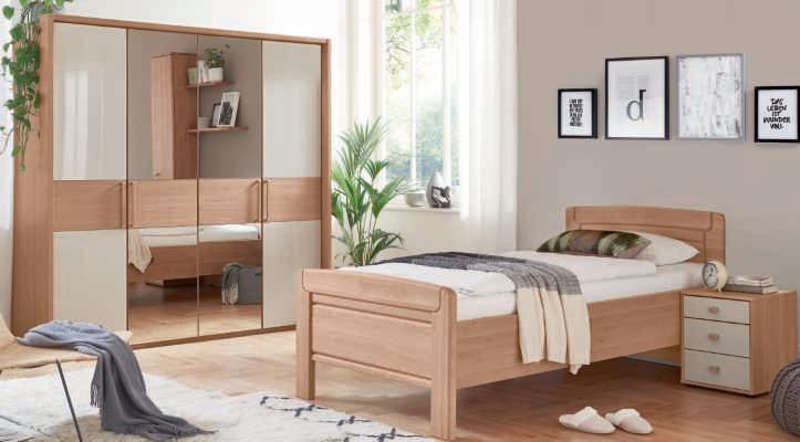 SCHLAFZIMMER-PROGRAMM, Balkeneiche furniert, Lack taupe, best. aus: 6-trg. Kleiderschrank , Außentüren mit Wellenprofil, inkl. Passepartout, ca. B300/H230/T60 cm, Bettanlage mit Polsterkopfteil, Stoff Senta beige 100% Polyester, Liegefläche ca. 180x200 cm, 2 Hängenachtkonsolen inkl. Paneelaufsätzen mit Glasböden und Wellenprofil. 104047
