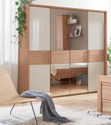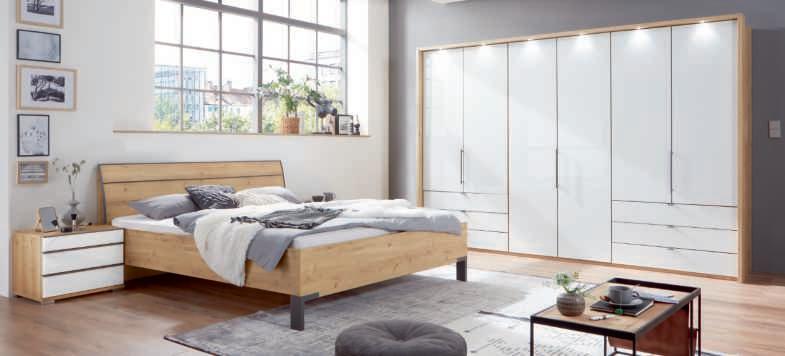 SCHLAFZIMMER-PROGRAMM, Front Asteiche Bianco massiv, Oberfläche geölt, Korpus Eiche Melamin Nachbildung, geölt, Applikationen sandgestrahlt. Diese Möbel enthalten eingebaute LED-Lampen. Die Lampen können in der Leuchte nicht ausgetauscht werden. Z14001