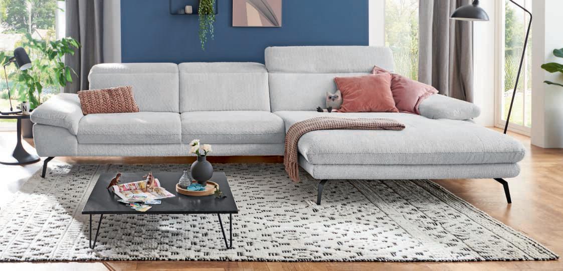 Bezug Stoff Kama silver, Metallfuß schwarz, best. aus 3-Sitzer mit Armteil links und XL-Canapé mit Armteil rechts. Inkl. Kopfteilverstellung an allen Elementen. Stellmaß ca. 345x191 cm.