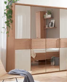 SCHLAFZIMMER-PROGRAMM, Balkeneiche furniert, Lack taupe, best. aus: 6-trg. Kleiderschrank , Außentüren mit Wellenprofil, inkl. Passepartout, ca. B300/H230/T60 cm, Bettanlage mit Polsterkopfteil, Stoff Senta beige 100% Polyester, Liegefläche ca. 180x200 cm, 2 Hängenachtkonsolen inkl. Paneelaufsätzen mit Glasböden und Wellenprofil. 104047