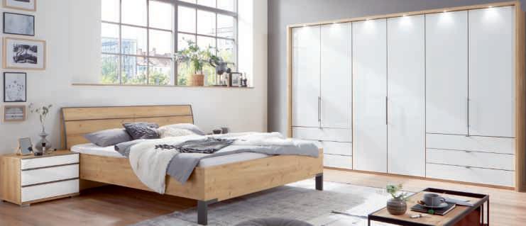 SCHLAFZIMMERPROGRAMM, Front und Korpus Lack weiß, Absetzungen Wildeiche furniert.