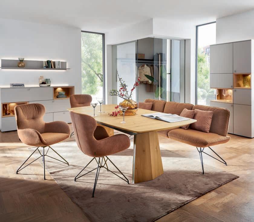 Interliving Esszimmer Serie 5121 - 1I Design-Esstisch, Charakter-Eiche massiv geölt, Plattenformat mit Soft-Ecken, konische Säule auf ovaler Bodenplatte, Metall schwarz, ca. 200x100 cm. 2| Design-Armlehnenstuhl, Bezug Stoff Alpine thyme, asymmetrisches Grafikgestell, Stahl schwarz lackiert, 360° drehbar mit Rückholfunktion, Bezug: 100% Polyester. i26020 3I Interliving Esszimmer Serie 5505 - Esstisch, Artisaneiche Nachbildung, Bodenplatte Metall schwarz Struktur, mit Ansteckplatte ca. 48 cm erweiterbar, ca. 130-178x90 cm. Interliving Esszimmer Serie 5505, 4I Eckbank und 5I Polsterstühle, Bezug Mikrofaser lightbrown, Gestell Kufe Metall schwarz Struktur. Bezug: 100% Polyester. Ohne Zierkissen. 6I Polstersessel, Bezug Stoff caramel, Stativgestell Metall schwarz Struktur, drehbar mit Rückholfunktion. Bezug: 100% Polyester. H64010