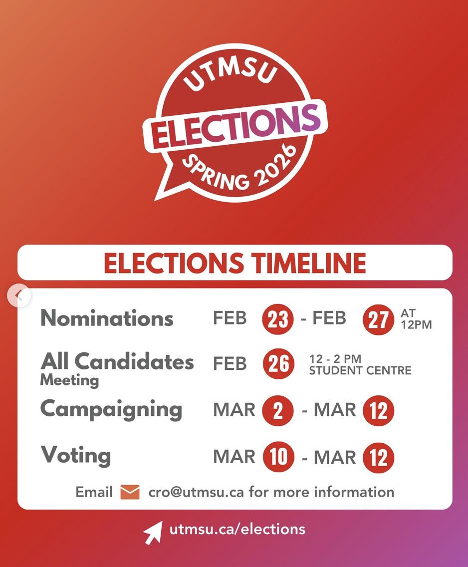 Students can learn more about the upcoming elections and find the un official election results afterwards at UTMSU’s ‘Elections’ page on their website.