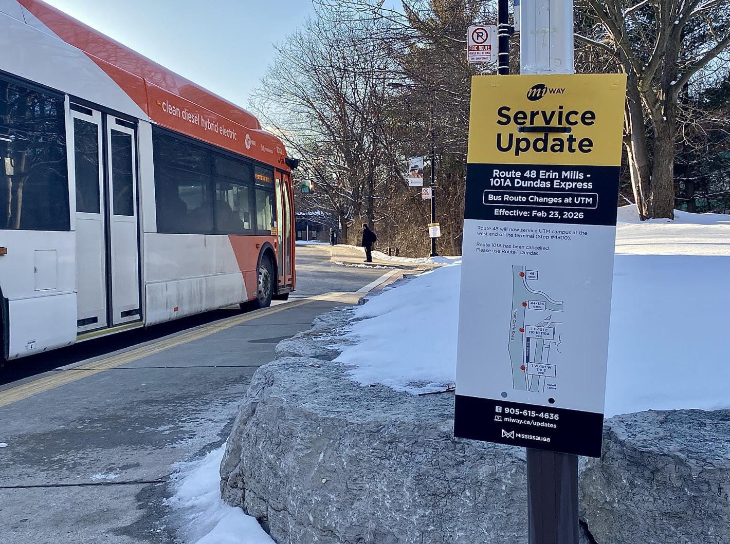 MiWay recently announced a series of changes to its bus services to the University of Toronto Mississauga (UTM) campus, including new routes, cancellations, and stop relocations, effective as of February 23.