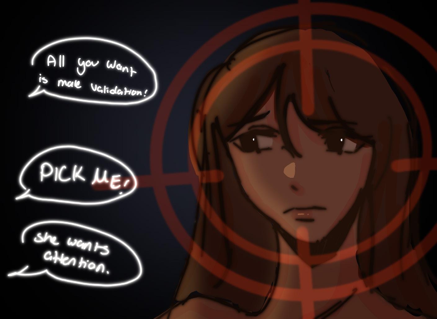The construction worker whistled across the street. Nice ass! Her classmate whispered in her ear. Why won’t you respond to me? Said every man, ever. Followed by, Ugly, selfish bitch! Again, and again. Over, and over.