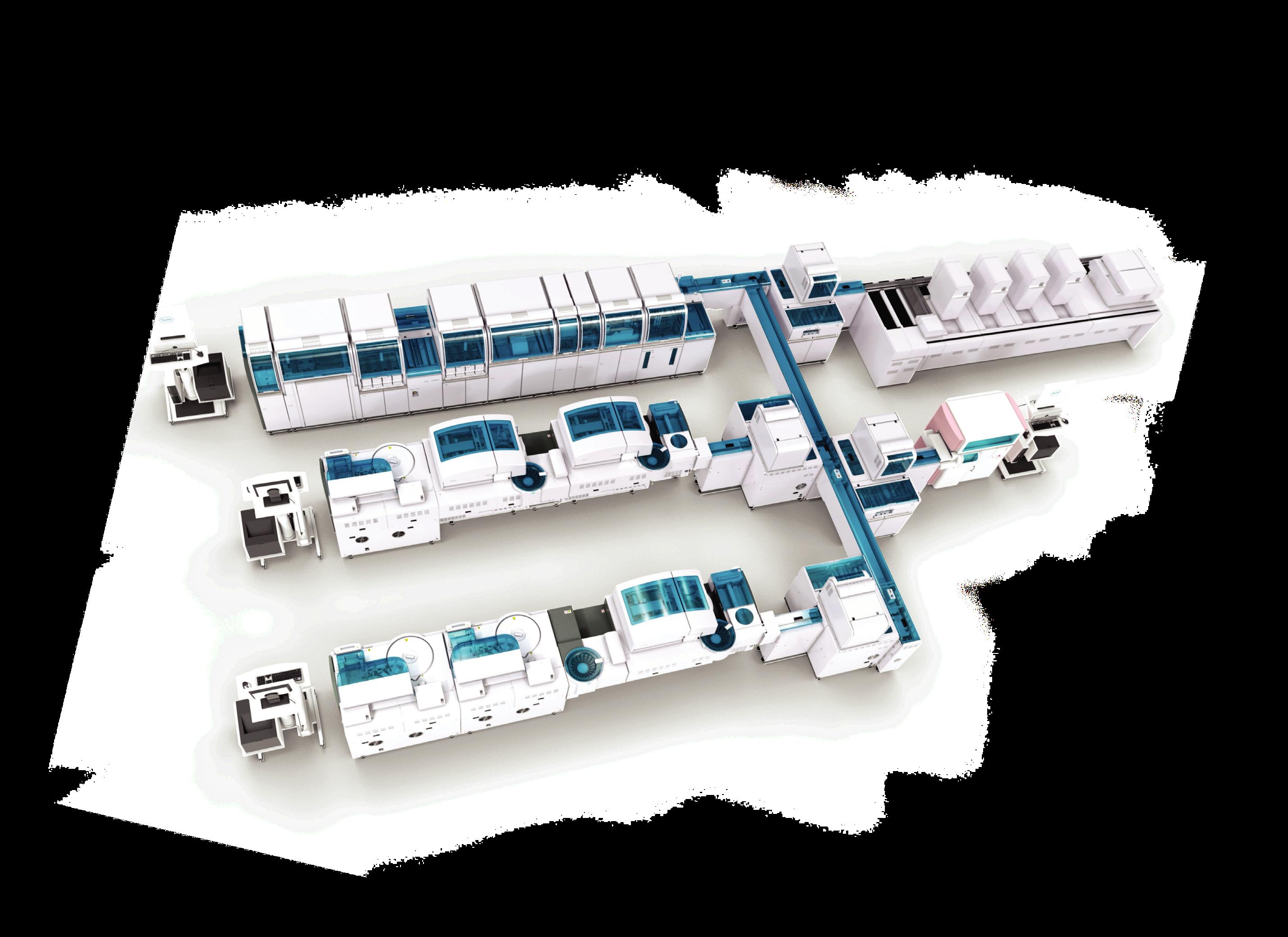 Hệ thống tiền phân tích (phân loại mẫu, kiểm tra chất lượng, ly tâm, mở nắp hoàn toàn tự động) với công suất xử lý 3.600 test/giờ.
