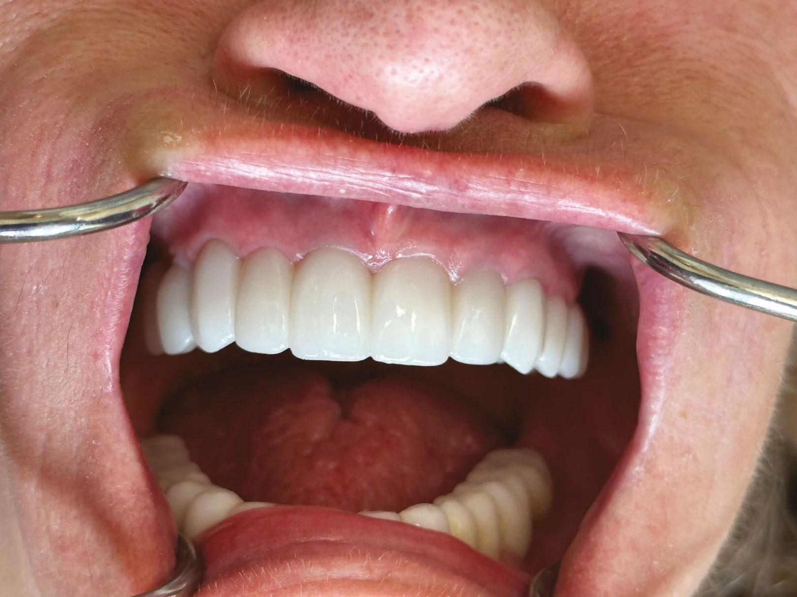 Most importantly, patients loved the feel. The 3 on 6™ doesn’t rely on the palate for stability, doesn’t need to be removed for cleaning, and doesn’t simulate tissue — it replaces only the teeth. For patients who had struggled with dentures or the “false” feeling of All-on-4, this was a restoration that felt like they had their real teeth back.