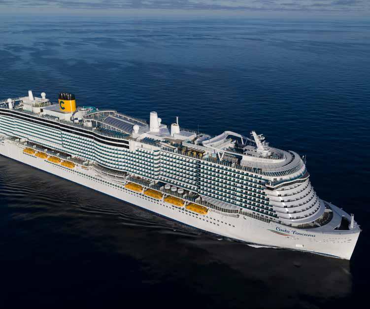 dos por chefs renomados parceiros da companhia. O navio conta ainda com 13 bares e lounges distribuídos pelos decks, além de áreas dedicadas ao lazer e relaxamento, com quatro piscinas, spa, academia e salão de beleza. A programação de bordo inclui espetáculos, música ao vivo e atividades interativas ao longo do dia, oferecendo diferentes opções de entretenimento durante a viagem. O Costa Toscana também dispõe de três áreas dedicadas ao público infantil, com espaços pensados para diferentes faixas etárias. Outro diferencial está na tecnologia empregada na operação. O Costa Toscana é movido a gás natural liquefeito (GNL), combustível que contribui para a redução das emissões durante a navegação e integra a estratégia da companhia de investir em soluções mais eficientes para a operação marítima. Ao longo dos decks, o navio reúne ambientes que combinam design contemporâneo, tecnologia e diferentes propostas de convivência. Entre restaurantes, áreas de lazer e espaços de entretenimento, o Costa Toscana apresenta uma variedade de ambientes pensados para diferentes momentos da viagem.