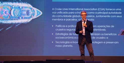 Marco Ferraz, presidente da Clia Brasil, trouxe novidades sobre a evolução da indústria, destacando as transformações que estão acontecendo nos navios e na operação como um todo. “As companhias estão investindo em tecnologia, muita coisa mudando no navio: a tinta, o casco, o formato do casco, diminuindo a energia a bordo, quartos inteligentes, que desligam a cabine quando a pessoa sai, desligam o ar-condicionado de forma inteligente, muita coisa mudando”, explicou Ferraz.