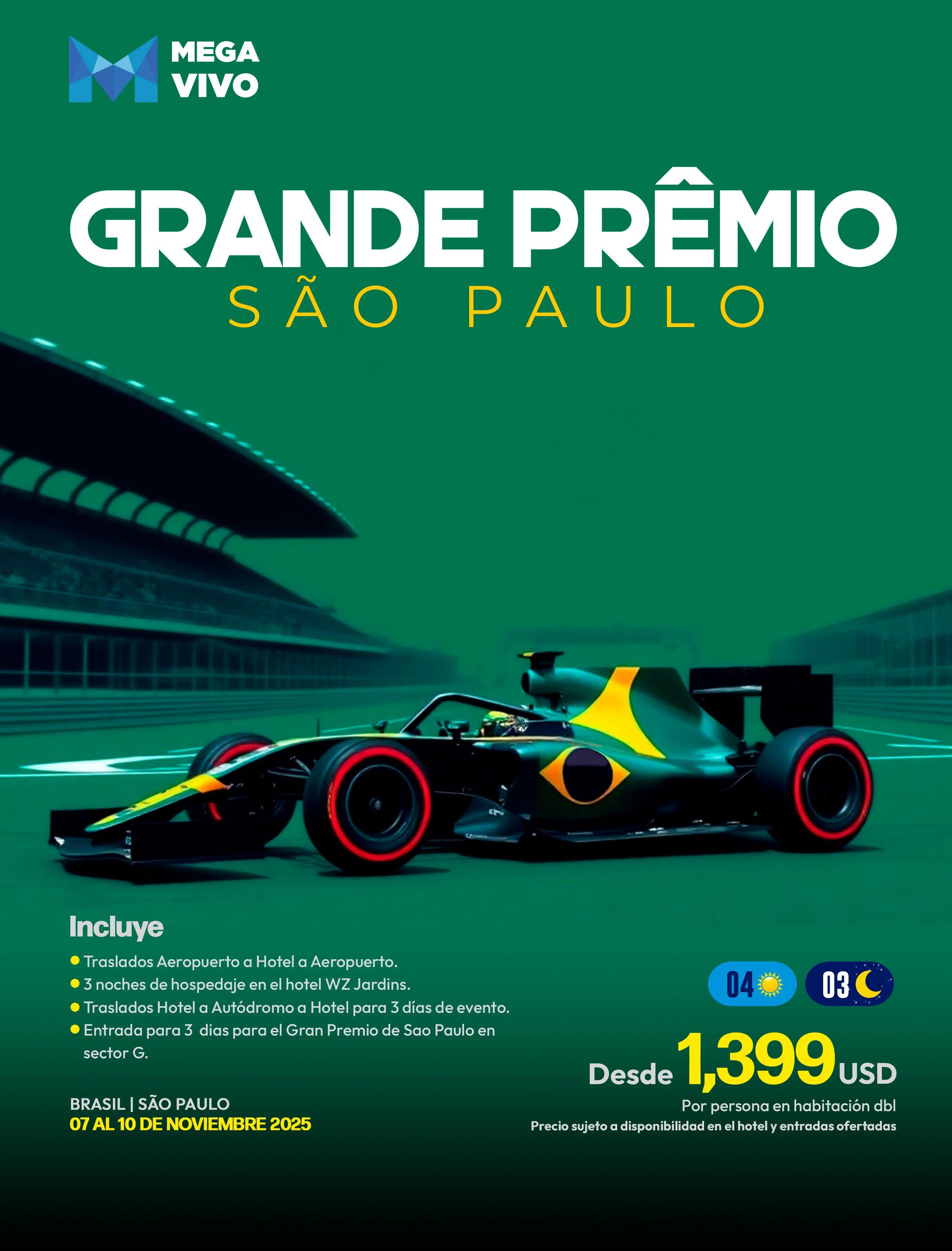Seguimos innovando con experiencias únicas, como nuestro Mega en Vivo del Gran Premio de São Paulo, un evento de talla mundial donde la velocidad, la emoción y el turismo se combinan para brindar una vivencia sin igual. Si eres amante de la F1, esta es tu oportunidad de disfrutarlo de una manera exclusiva.