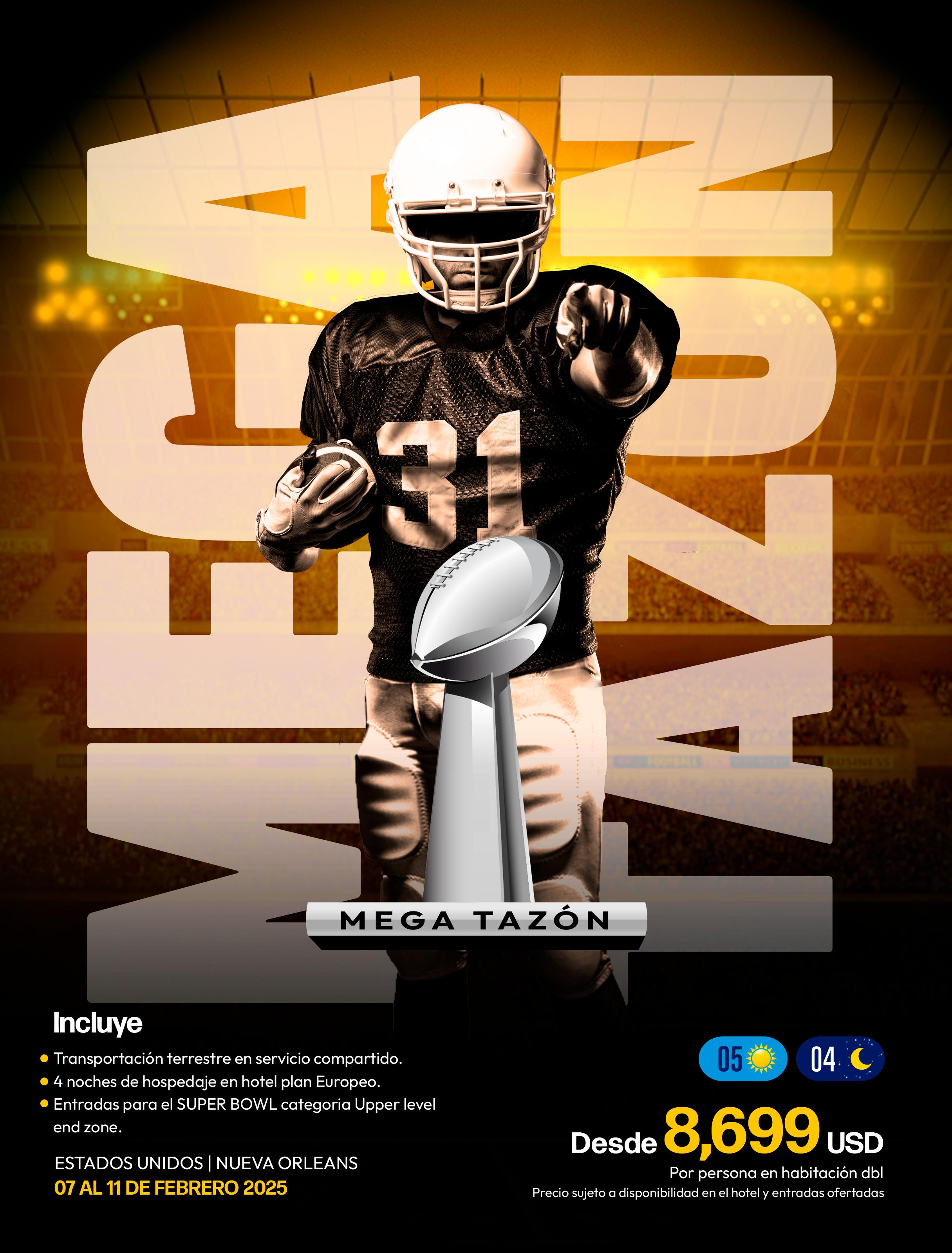 Cerramos el año con Mega en Vivo, haz que tus clientes vivan el Super Bowl 2025 en el legendario Caesars Superdome de Nueva Orleans. Una ocasión irrepetible para experimentar la grandeza de este espectáculo deportivo.