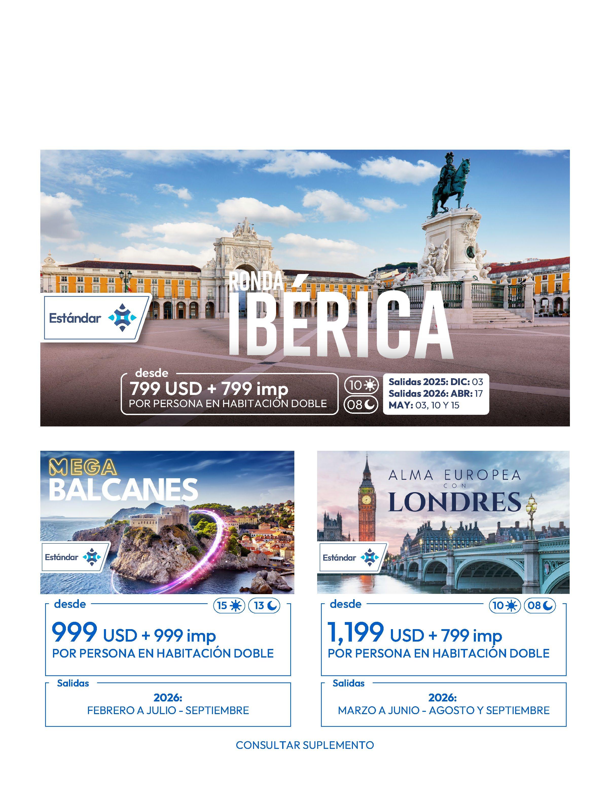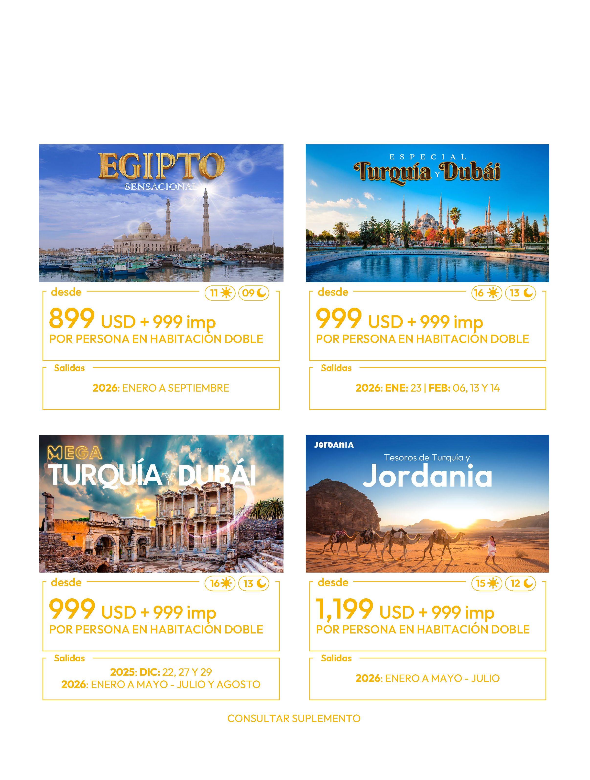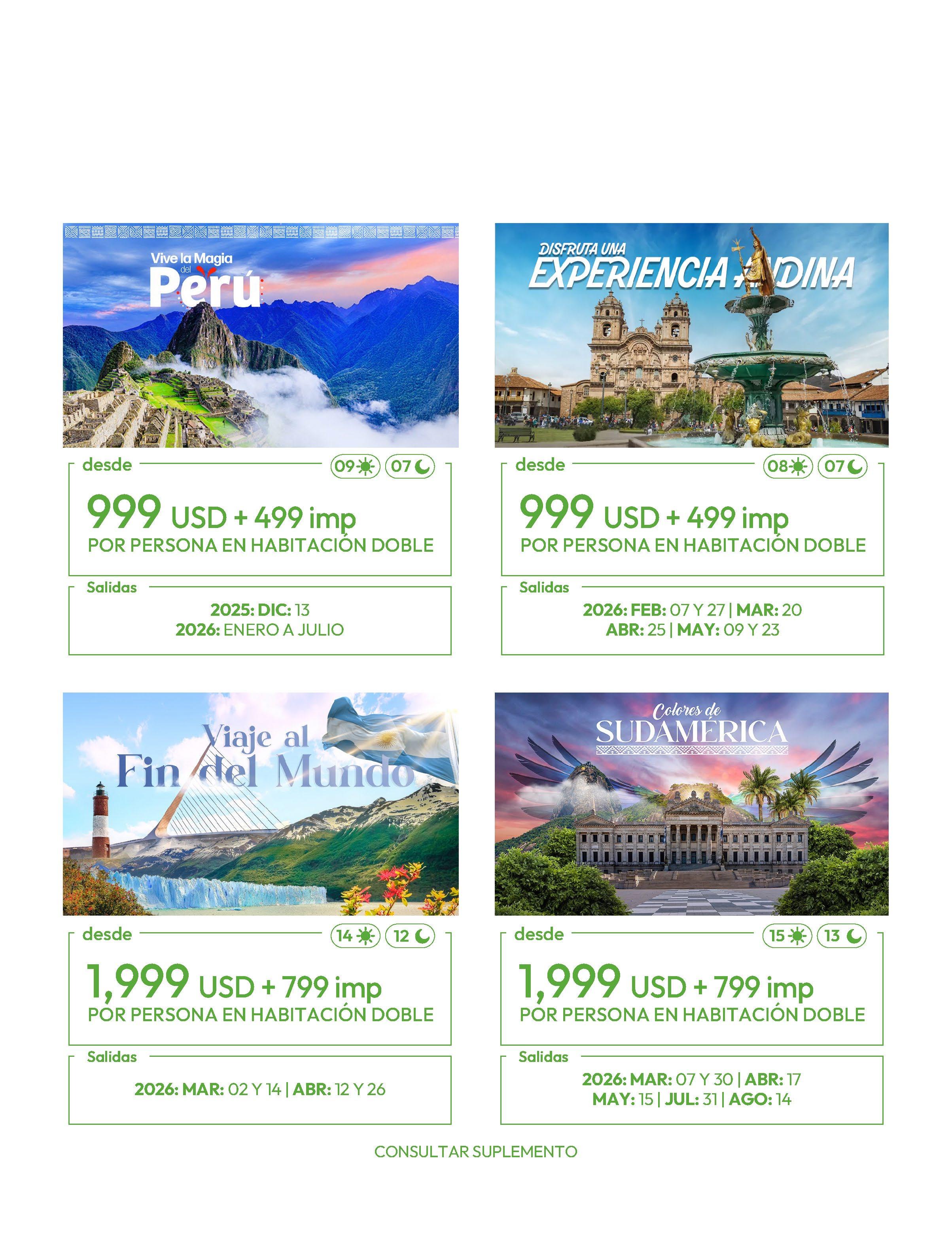 Todos los paquetes descritos en esta publicación incluyen lo siguiente (de acuerdo a itinerario)
