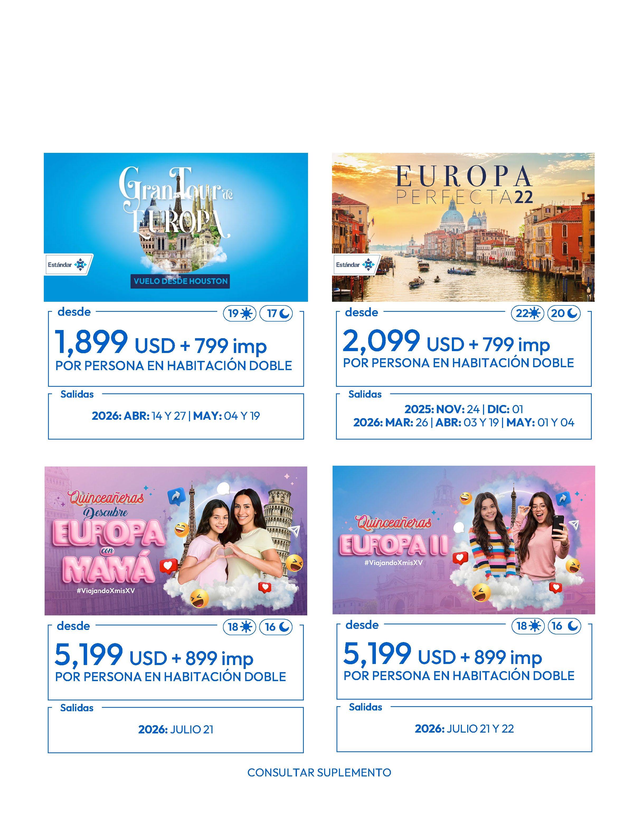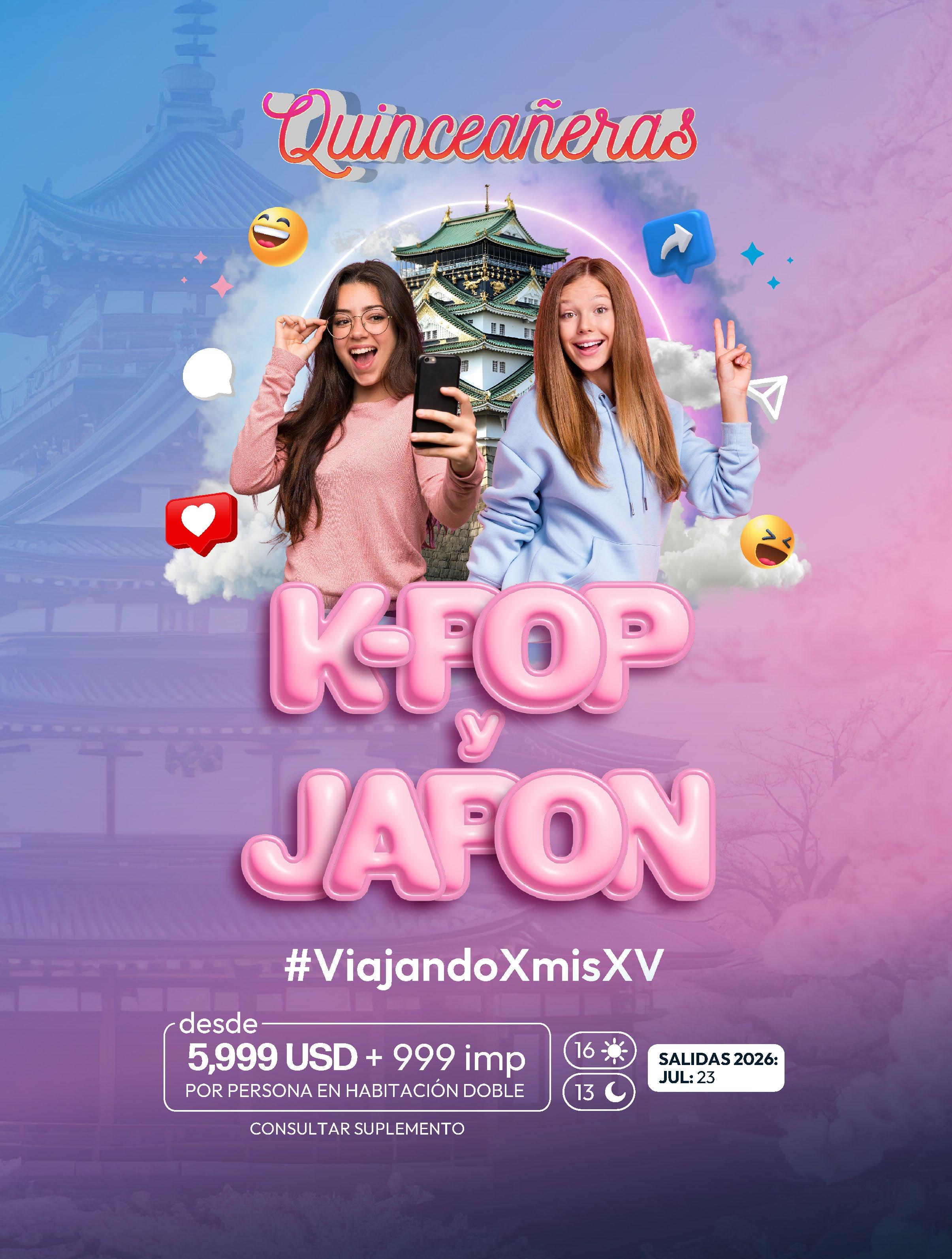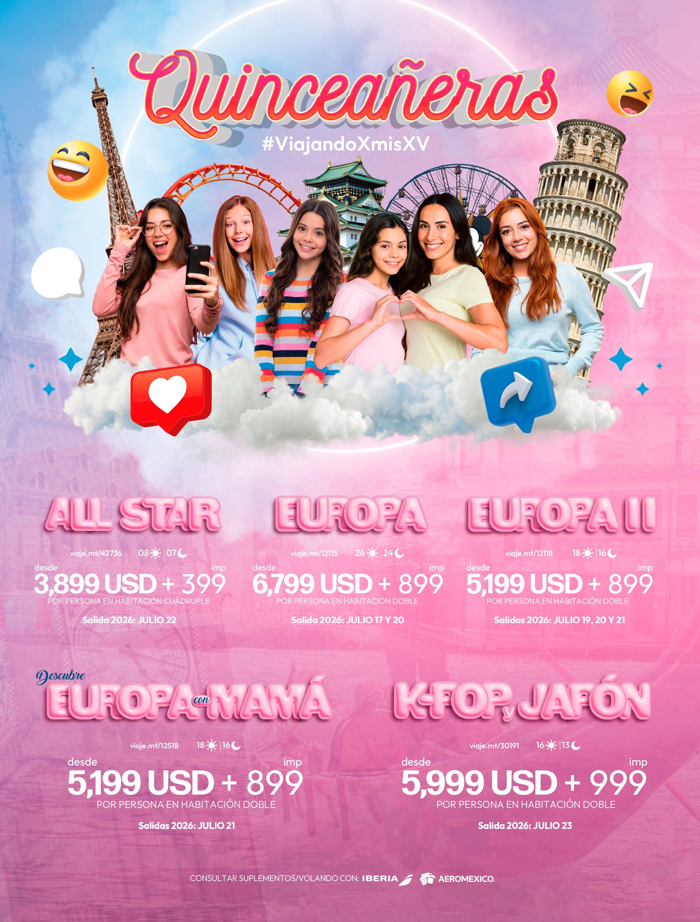 Y, por supuesto, continuamos presentando nuestros cinco programas para Quinceañer@s, diseñados para quienes desean vivir una experiencia única en una etapa inolvidable. Nuestros itinerarios abarcan destinos emblemáticos como Europa, Japón y Estados Unidos, combinando diversión, cultura, aprendizaje y momentos que permanecerán para siempre en su memoria. Cada programa está creado para ofrecer seguridad, acompañamiento y experiencias extraordinarias que marcan una diferencia real.