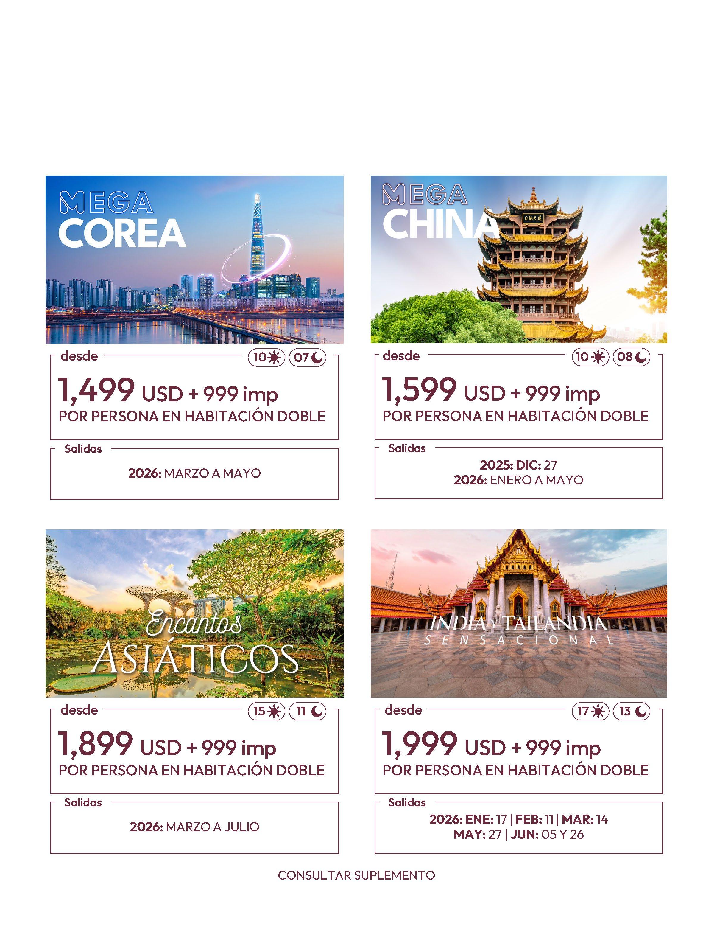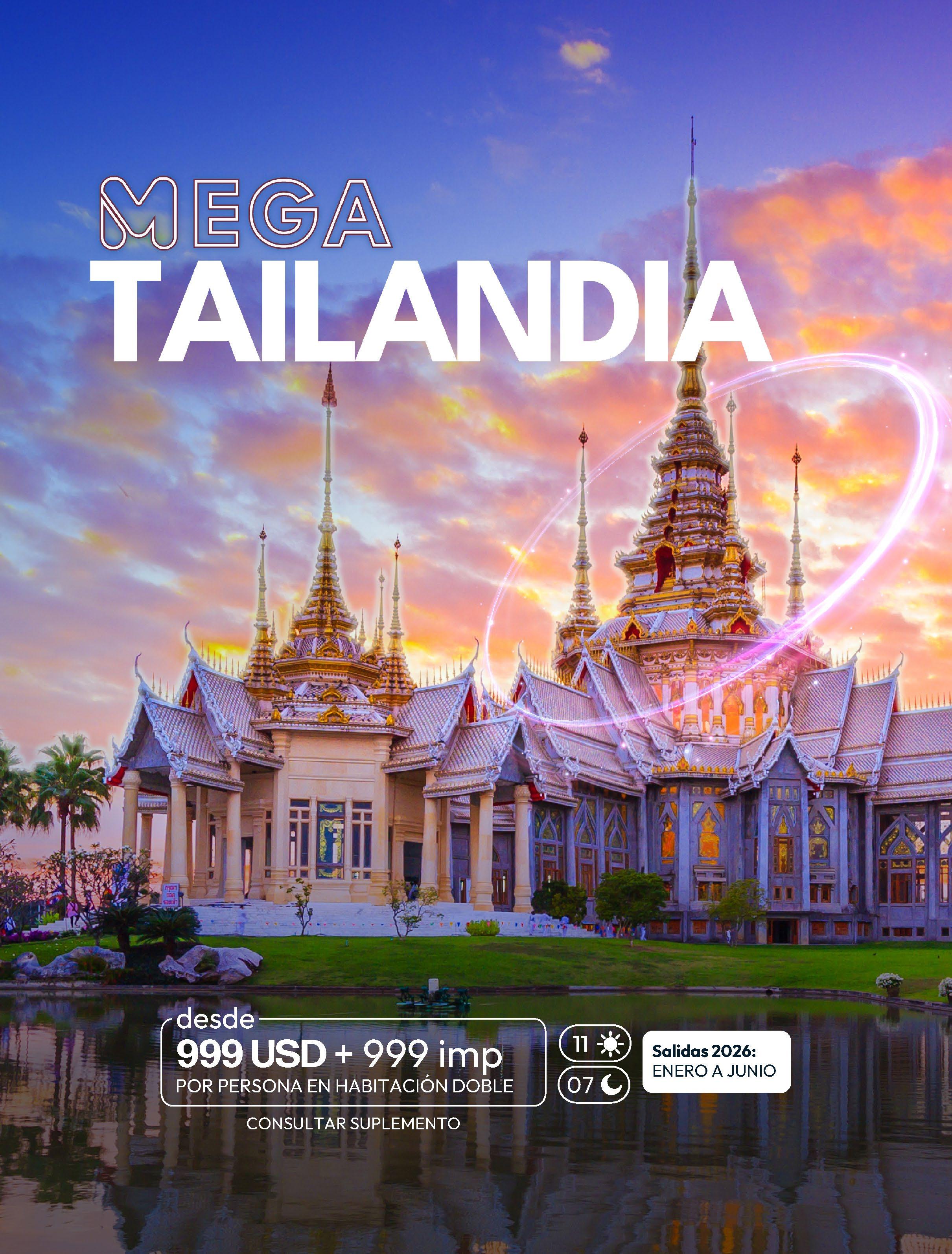 PRECIOS PUBLICADOS DE CARÁCTER INFORMATIVO. Dado que se sujetan a requerimientos específicos del cliente como son entre otros, sin ser limitativos: número final de pasajeros; clase de vuelos; categoría de hoteles; clase de ocupación sencilla, doble triple, etc. edades; condiciones especiales. Ningún precio publicado es final en tanto el cliente no solicite una cotización formal de acuerdo a sus propias necesidades y presupuesto. PUBLICACIÓN DE PRECIOS EN MONEDA EXTRANJERA. Para servicios o paquetes que se disfrutan fuera de México. El precio de venta será el resultado de la conversión de la moneda extranjera a moneda nacional y podrán ser pagados en Pesos MXN al tipo de cambio que rija en el lugar y fecha en que se realice. El tipo de cambio se determinará conforme a las disposiciones de la Ley Orgánica Banco de México, Artículo 8º de la Ley Monetaria de los Estados Unidos Mexicanos y apartados 5.1.3 y 6.2.4 de la Norma Oficial Mexicana NOM-010-TUR-2001. INFORMACIÓN PÚBLICA. El tipo de cambio del día, formas de pago, contrato de adhesión, extracto del contrato de adhesión, itinerarios, aviso de privacidad, requisitos de visados, sanitarios y generales para la realización de los viajes, forman parte de las documentales del proceso de cotización, reservación y venta pudiendo ser consultadas en todo momento en la página de internet www.megatravel.com.mx FUNDAMENTO JURIDICO. El Contrato de Adhesión se elabora conforme a las regulaciones de Ley Federal de Protección al Consumidor; Ley Monetaria de los Estados Unidos Mexicanos; Norma Oficial Mexicana NOM-010-TUR-2001.