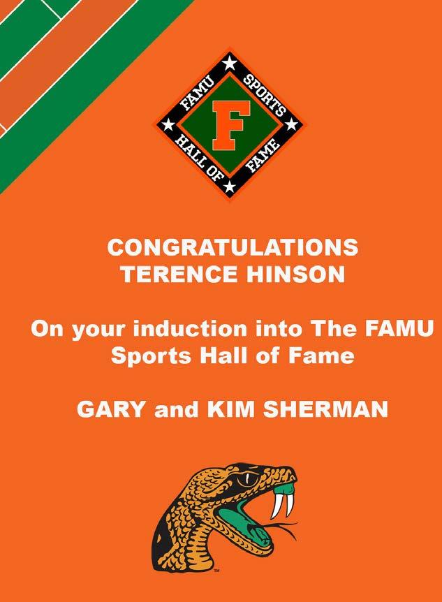 72 Terri D. Sherman,PA Certified Business Intermediary Terri@MindYourBusinessToday.com | (888) 925-5055 x 207 Broker: Florida Business Exchange, Inc. 4600 Touchton Rd. East, #1150, Jacksonville, FL 32246 CONGRATULATIONS TO TERENCE HINSON ON BEING INDUCTED INTO THE FAMU SPORTS HALL OF FAME We are SO proud of all of your accomplishments!