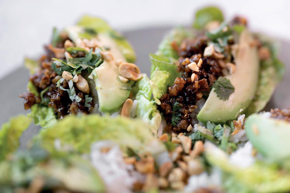 Brødet varmes. Ha på et salatblad og salat. Vegansk mayo med urter og chilisaus/shriracha