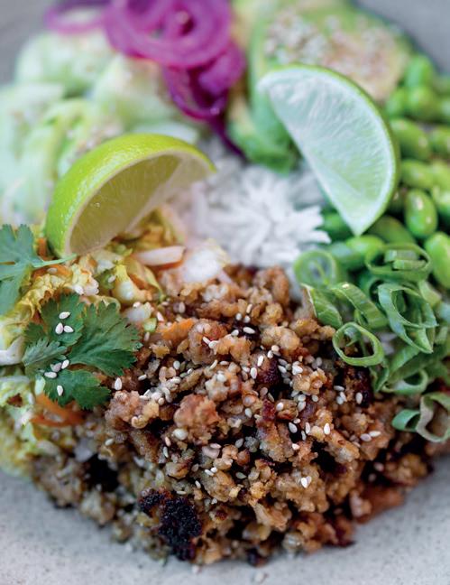 5. Ha varm kokt ris, varme Favarittboller, spinat, syltet rødløk, edamamebønner, mango, sukkererter og agurk i en vid serveringsskål.