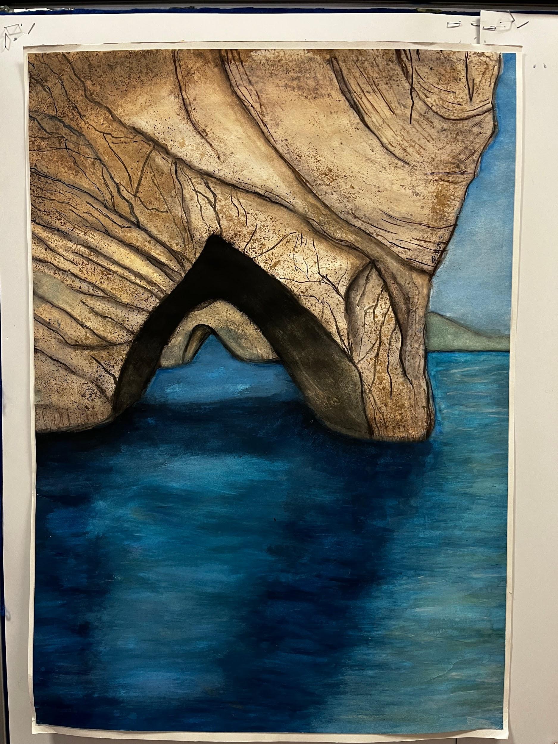The focal point of this painting is the centre of the cave as it draws the viewer's eye through the use of texture and detail. It highlights the depth and structure of the cave, shown through the cracks, layers and uneven surfaces. The detail of the watercolour use helps create realism as the cave recedes inwards.