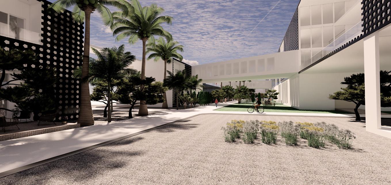 Along the transit stop holds a cafe and a daycare, residents cess into the daycare. There is also a koi pond within the Community bridges is at an FAR of 2.