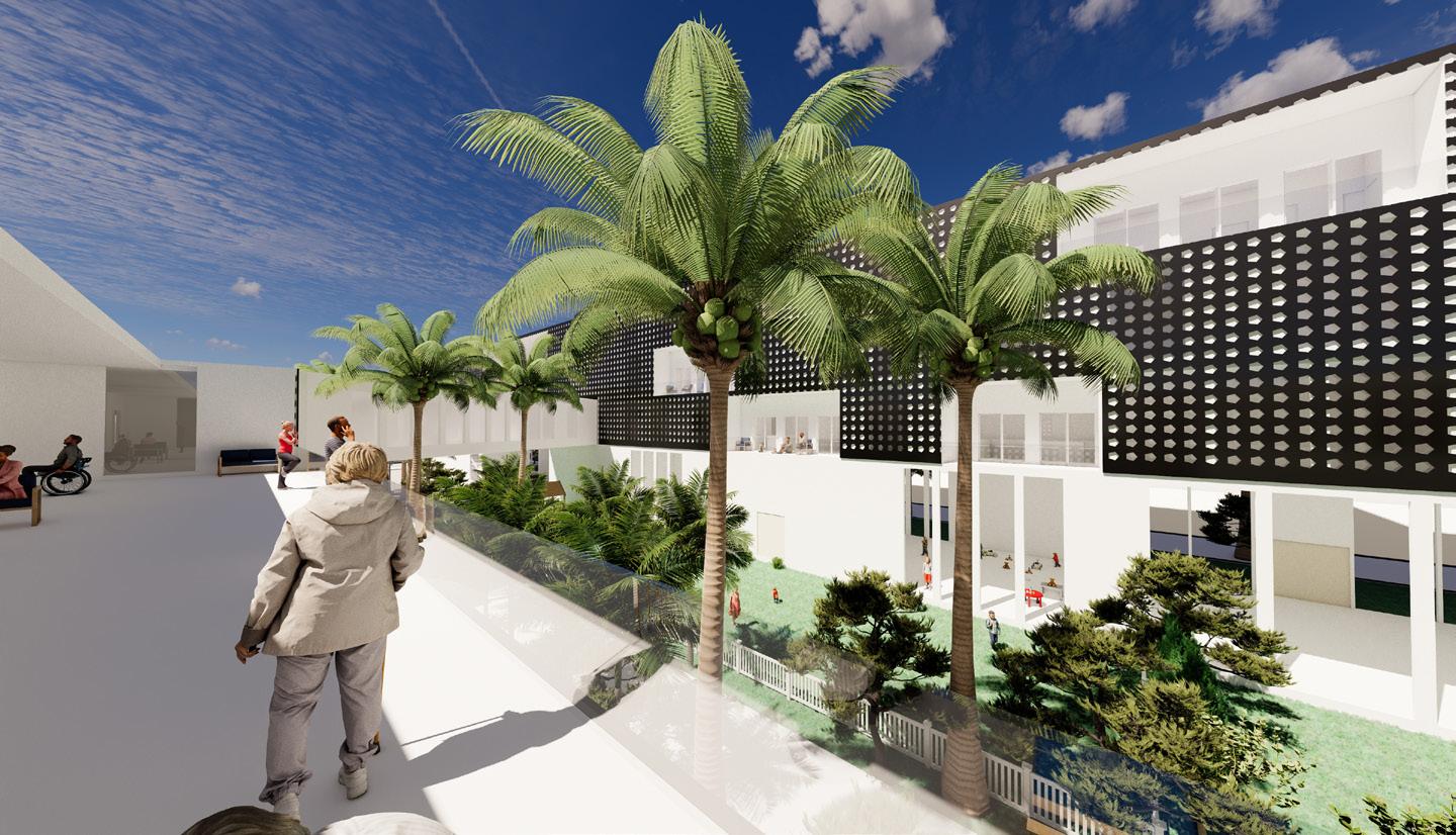 Community bridges is a development that houses both intergenerational family’s and senior living. The two are able to mingle withing the community courtyard that houses many seating and relaxation places. They are able to share a community room in one of the bridges and a gym that houses a rehab room in the other. Within all of the buildings there are a multitude of gathering spaces such as living room style community spaces, communal kitchens in the senior living and a multitude of outdoor baloneys that the residents can use to enjoy the LA weather. Along the transit stop holds a cafe and a daycare, residents withing Community Bridges are given priority access into the daycare. There is also a koi pond within the courtyard that serves as a learning space for the daycare. Community bridges is at an FAR of 2.
