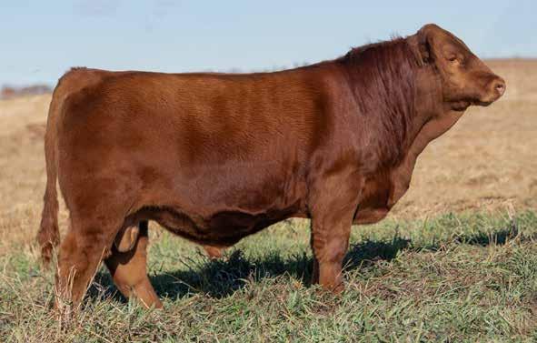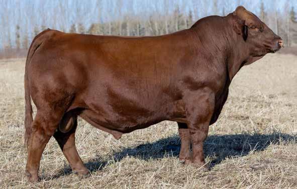 MD MADDOX 449M is an incredibly exciting young herd sire prospect who brings power, presence, and proven genetics to the forefront. He is especially impressive through his massive middle and exceptional length of spine. Sired by the wellknown and highly respected KHR Grizzly Red 39F Bull, his calves have arrived easily and consistently exhibit outstanding growth, style, and eye appeal. On the maternal side, his dam AWB WICKED 15E is the undisputed matriarch of our WICKED cow family. A heavymilking powerful female, she is admired for her structure— walking on an incredible foot and transmitting maternal strength across generations. With three generations of retained females at MacDonell Farms, this cow’s family legacy is just getting started.