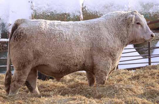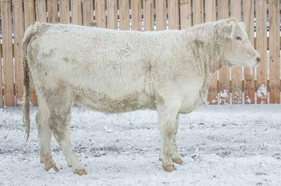 This white heifer is a sweet looking SOS Jackpot daughter from an older BarB Lady 59B cow. 59B still has good feet and udder. Should grow to be moderate size cow.