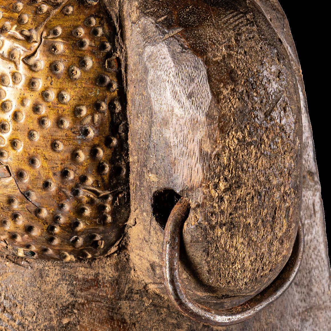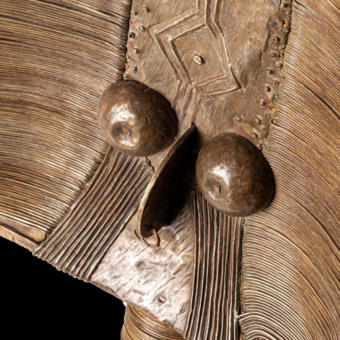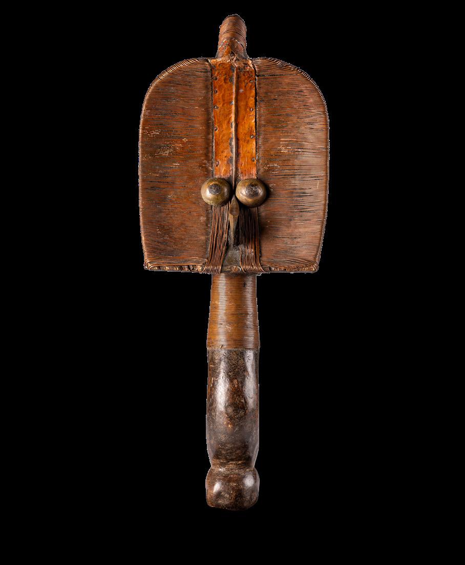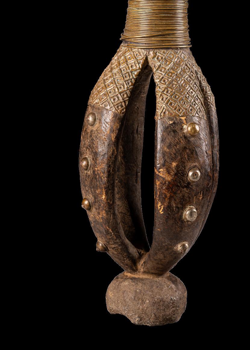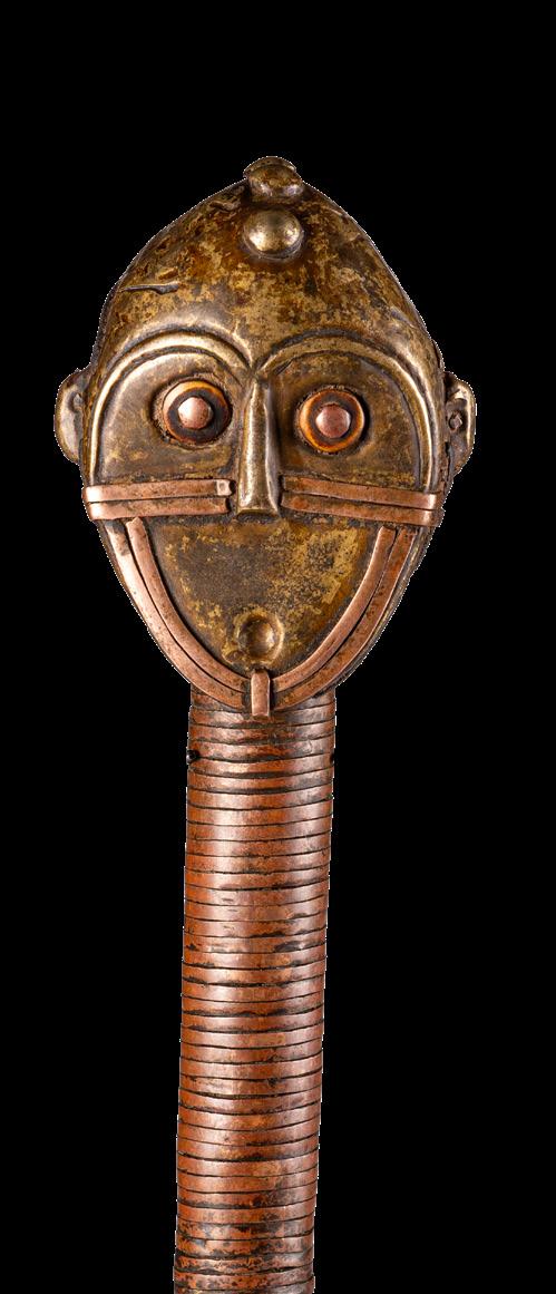 The reliquaries of the Obamba group in the Haut-Ogooué province of Gabon feature a concave face. The lateral sections often terminate in shapes that resemble earrings. The examples presented in this volume feature another distinctive trait typical of the Obamba: a massive, protruding forehead that casts a shadow over the eyes. Although some pieces display curls instead of earrings - a detail associated with the Ndasa tradition - the facial iconography, particularly the combination of a pronounced forehead and cabochon eyes, indicates that they belong to the Obamba group. This section also includes a striking example of a mbulu ngulu, expressively adorned with mbandjuala iron ‘tears’.