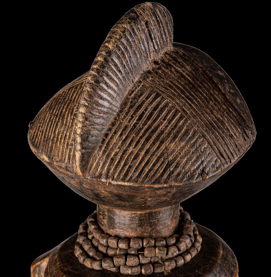 Other defining features of Mbete statues include their sagittal crest-shaped hairstyle, faces that often exhibit iron teeth, and eyes inlaid with cowrie shells, giving them a striking expression intended to ward off evil spirits.