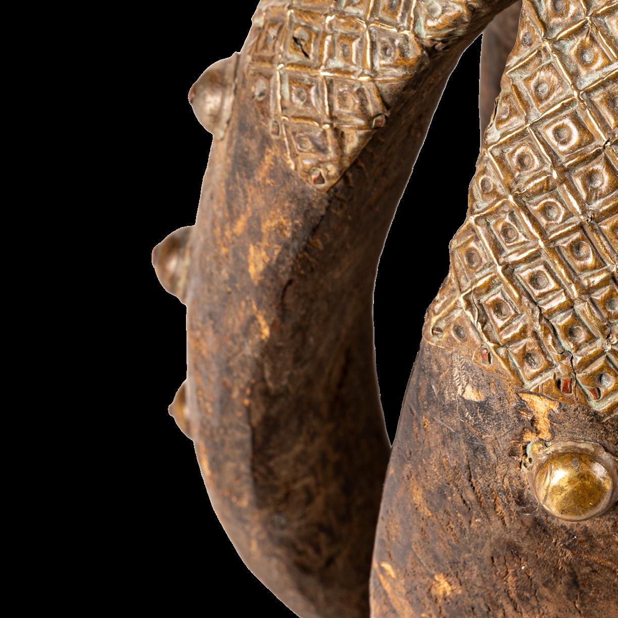 Nelle tradizioni dell’Africa centrale, il pitone è venerato come simbolo dell’eternità e del ciclo continuo di vita e morte. Spesso rappresentato sulle figure Kota come una sorta di corona, la sua forma a mezzaluna presenta generalmente incisioni che variano a seconda del clan.