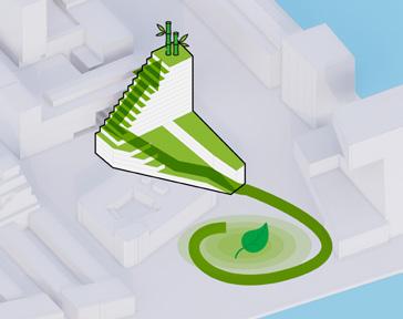 The stepped design with generous green terraces creates a strong relationship with the urban context while also referencing the history of the Lloydpier and eastern rice fields. The greenery is not added as a layer but forms an integral part of the building, contributing to biodiversity, quality of life, and the urban climate.