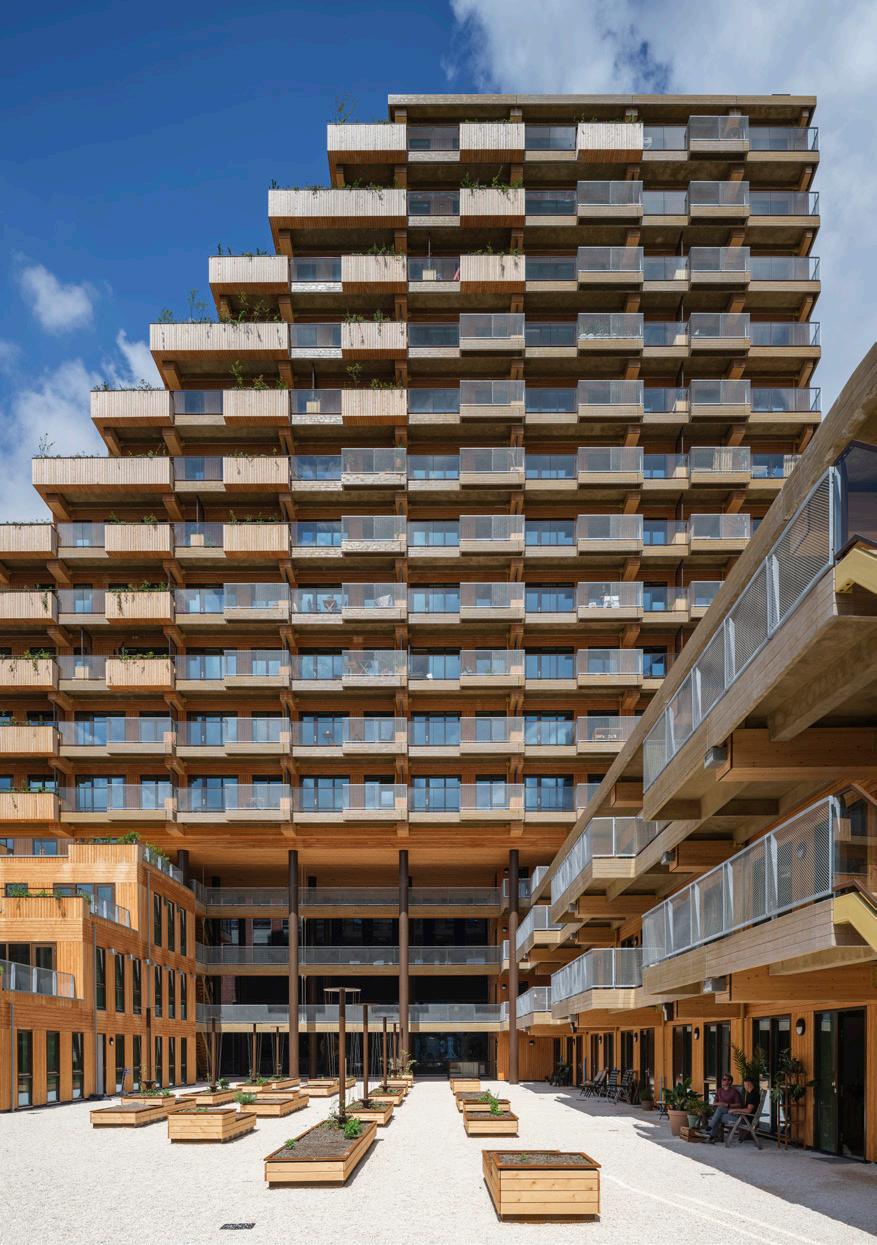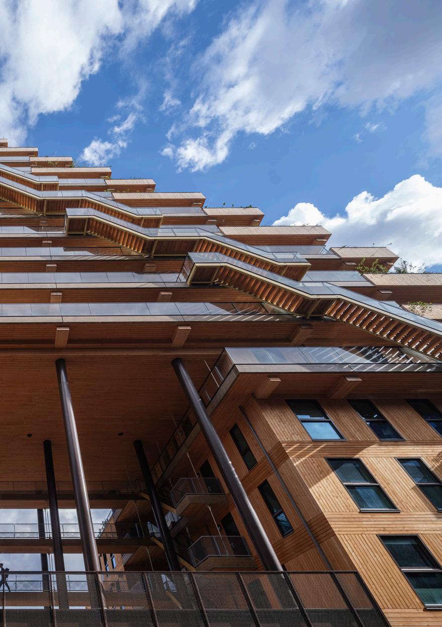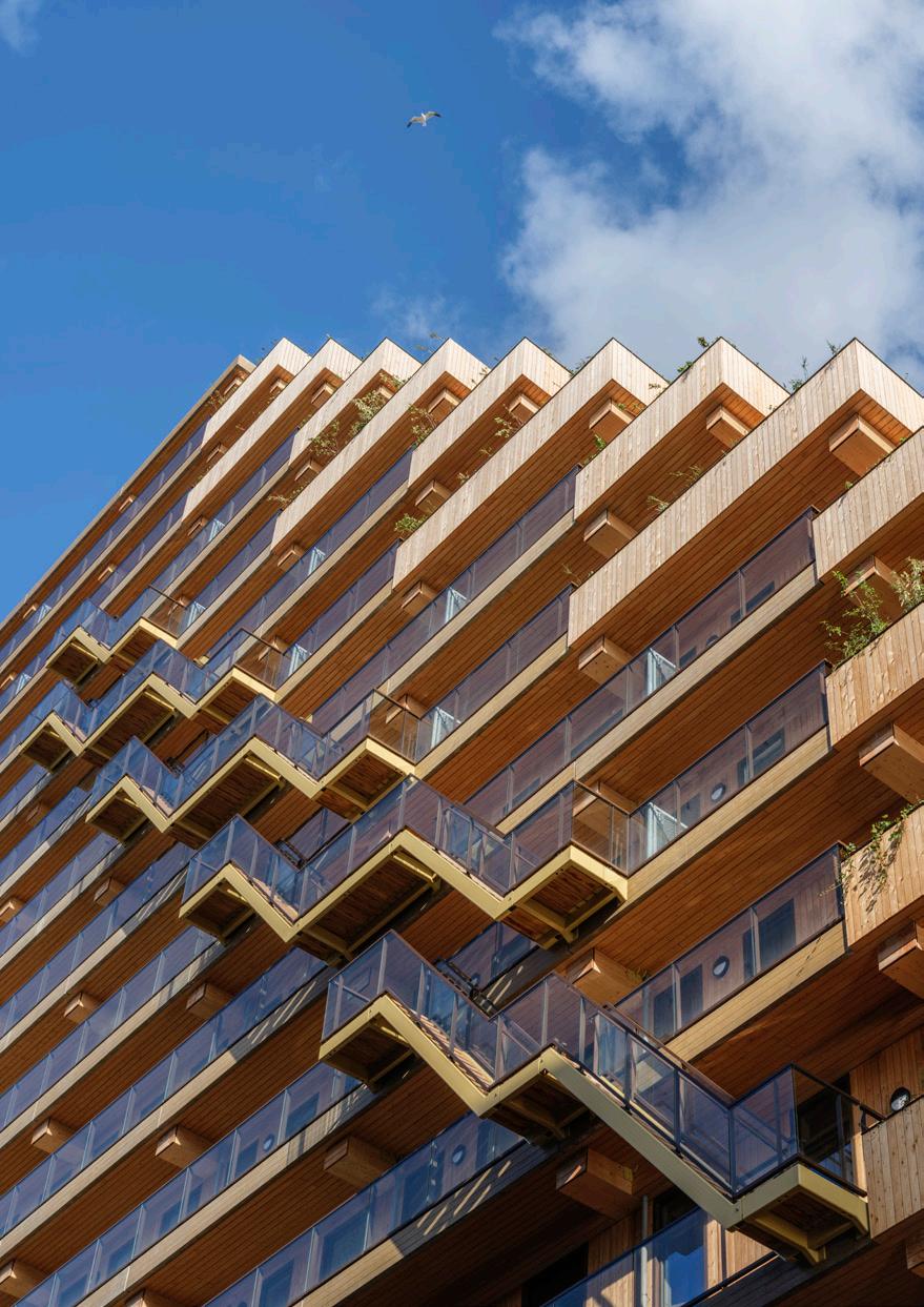 The stepped composition and the rhythm of the timber load-bearing structure give the building a strong architectural identity. The terraces, integrated planters, and visible timber construction create a layered and tactile appearance that differs from conventional high-density urban housing.