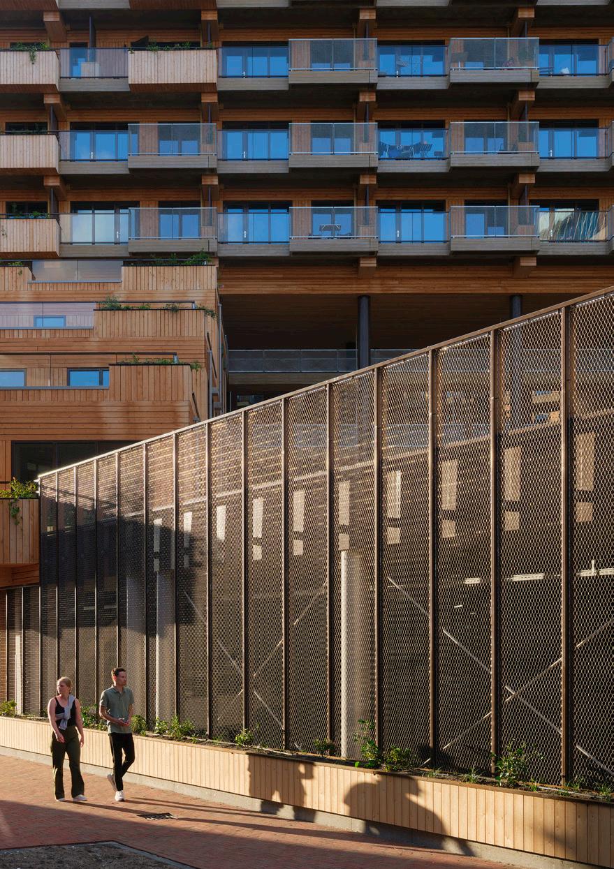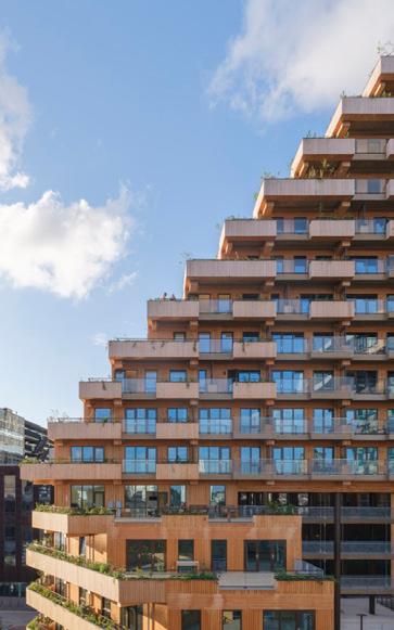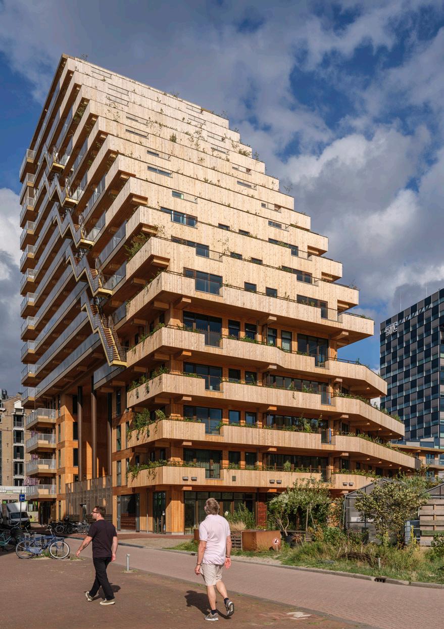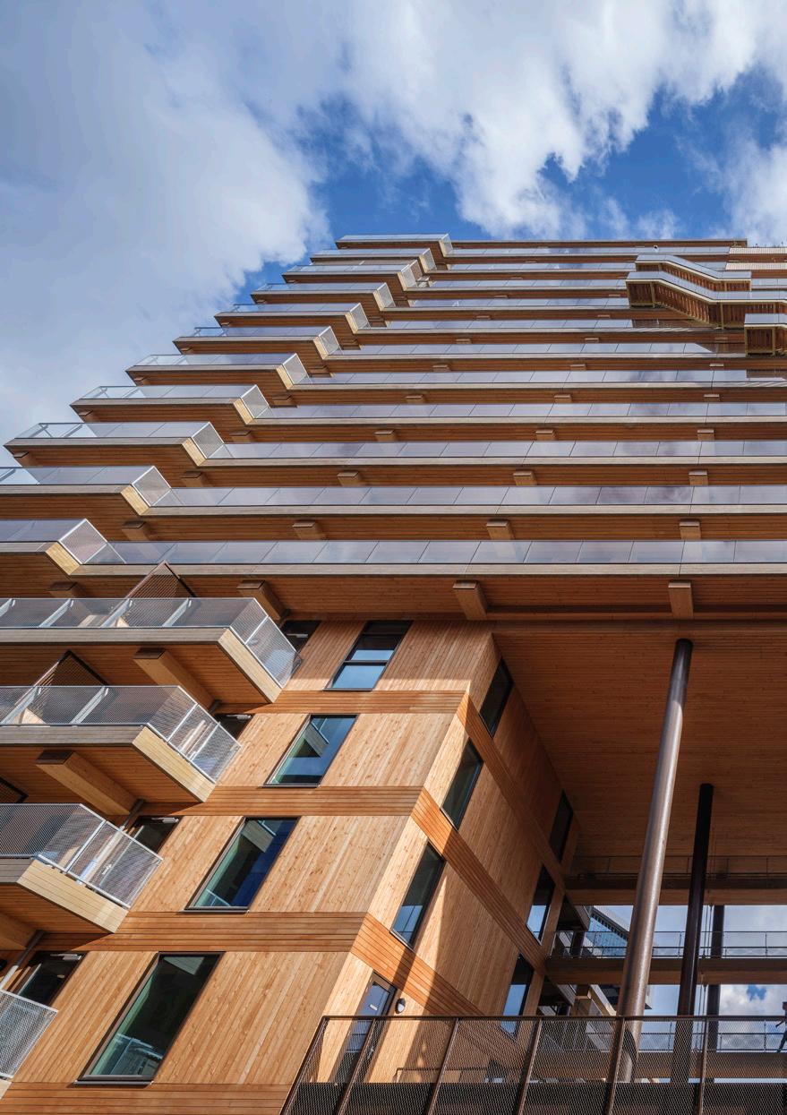 The stepped composition and the rhythm of the timber load-bearing structure give the building a strong architectural identity. The terraces, integrated planters, and visible timber construction create a layered and tactile appearance that differs from conventional high-density urban housing.
