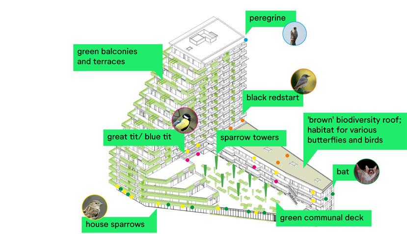 Greenery structurally integrated as habitat for plants, birds, and insects.