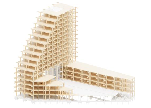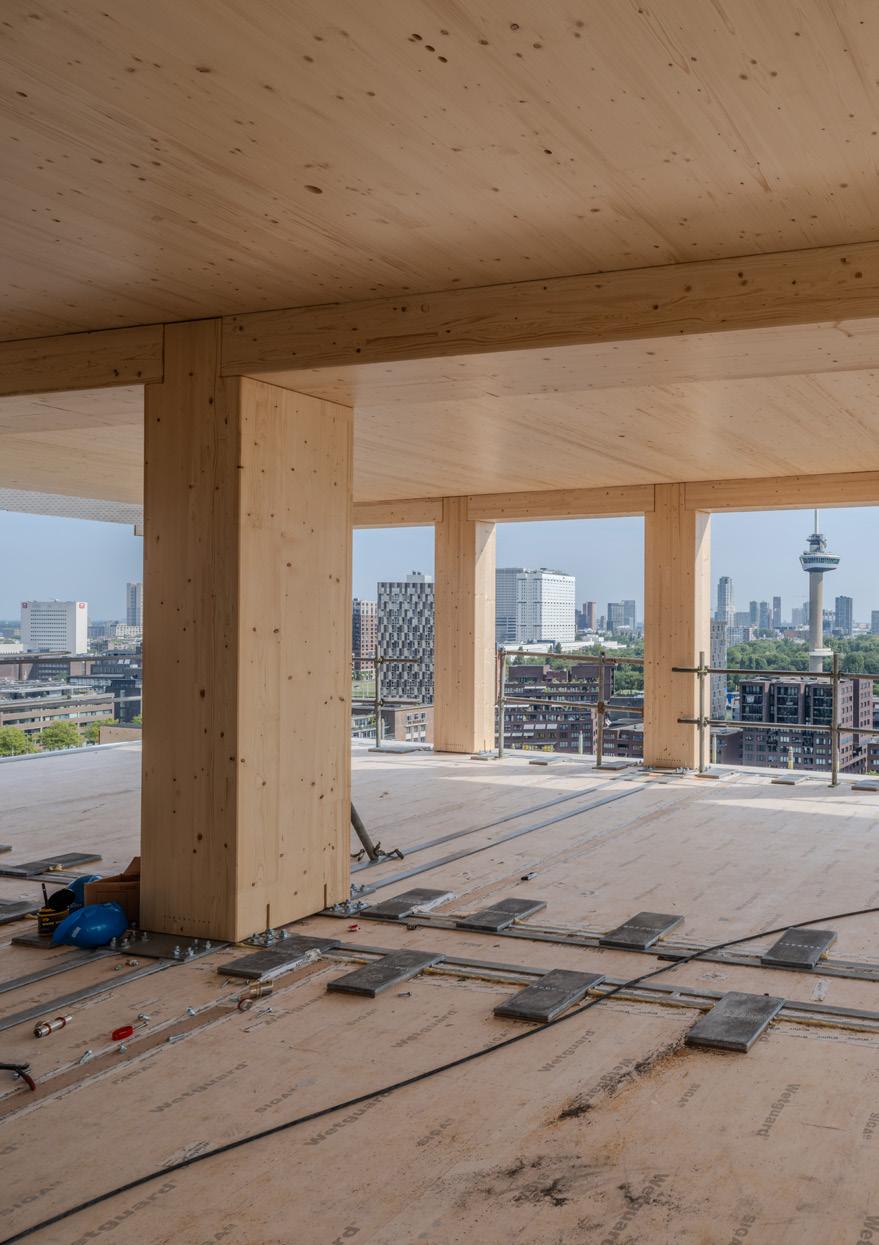 Het project is niet opgezet als optimalisatie van traditionele bouwmethoden, maar als een fundamenteel alternatief daarvoor. Hout vormt de dragende basis van het gebouw en bepaalt daarmee zowel de constructie als de architectuur. De hoofddraagconstructie is grotendeels uitgevoerd in Cross Laminated Timber (CLT) en gelamineerd hout, waarbij beton en staal tot een minimum zijn beperkt. Op deze hoogte en schaal is dat uitzonderlijk.